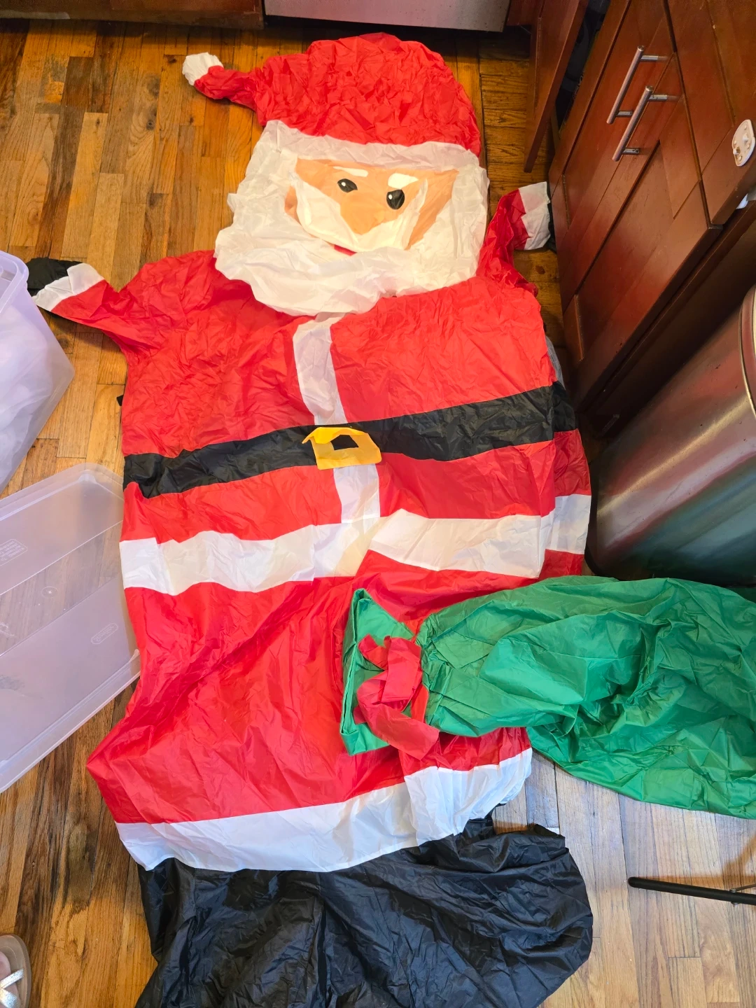 Selling an inflatable Santa decoration! It's perfect for adding some holiday cheer to your home. The decoration features Santa in his classic red suit with a green bag. Great for indoor or outdoor use during the Christmas season