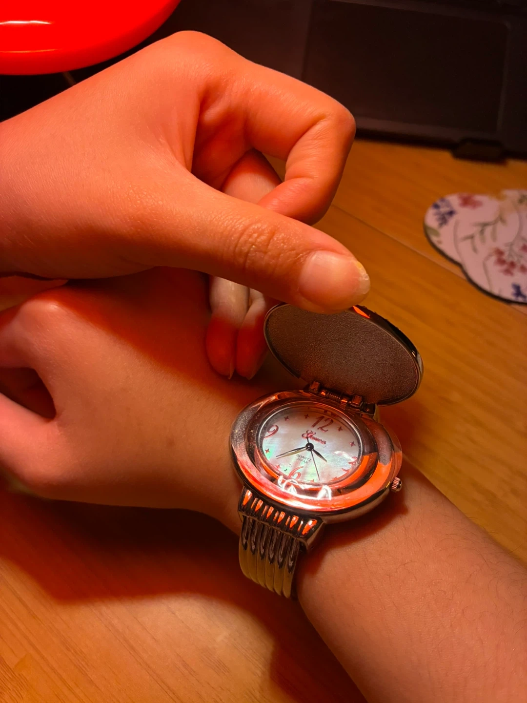 This women's watch features an oval mother of pearl dial with Arabic numerals. It's accented by a rhinestone-embellished bezel and a flexible metal band. A protective cover flips open to reveal the face.