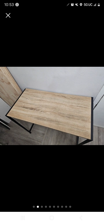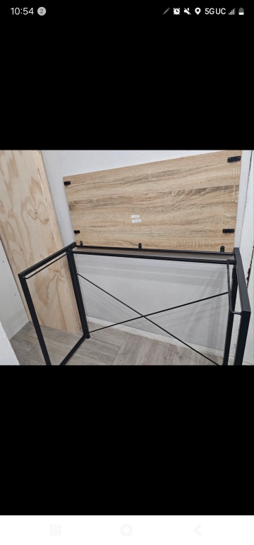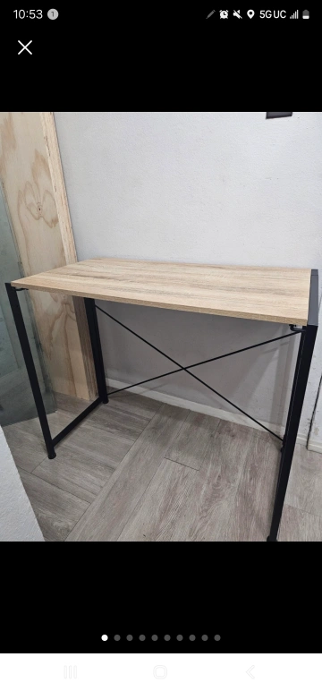 Small desk with black metal frame and light wood top. Minimalist design. Good for small spaces.