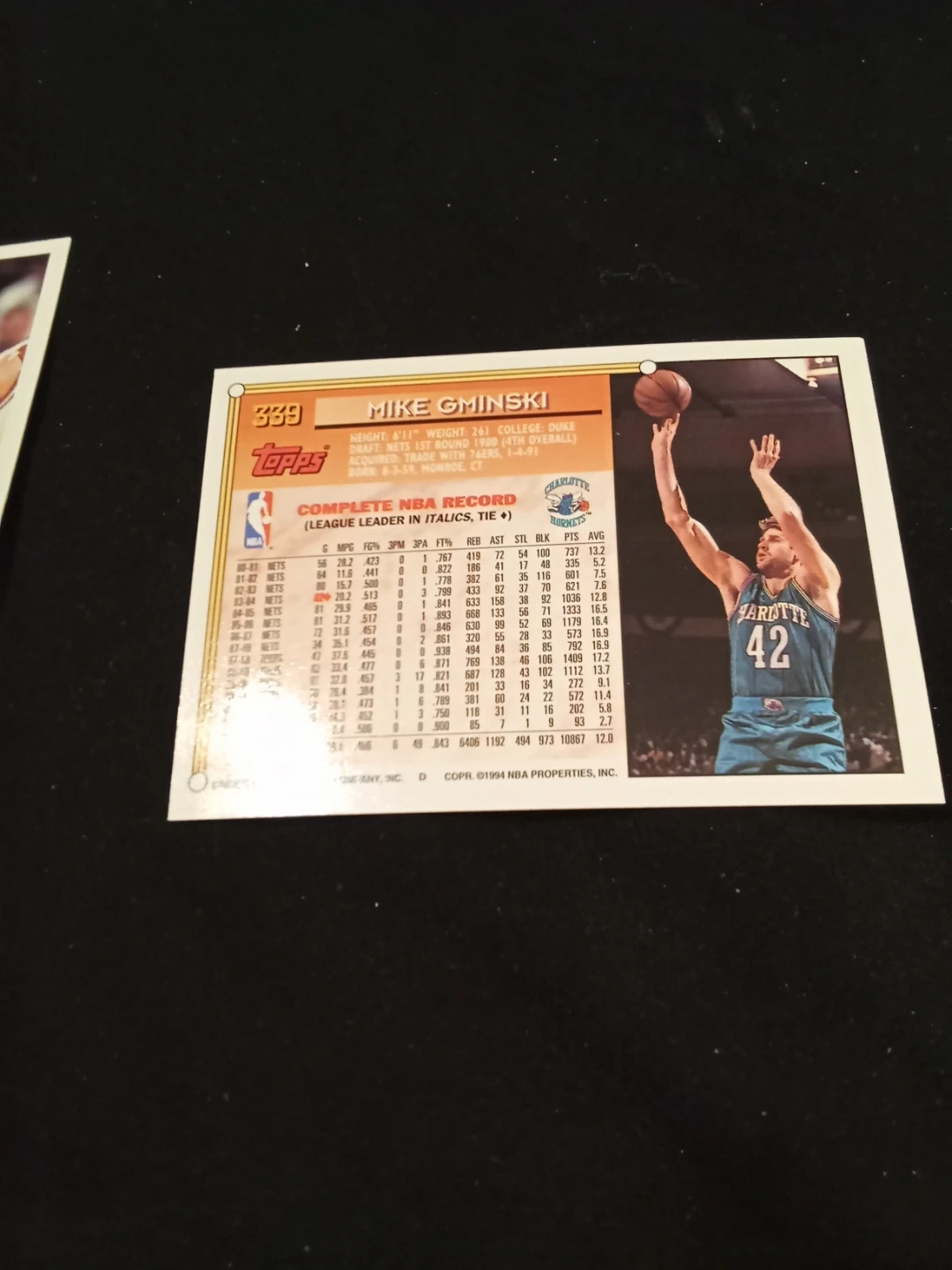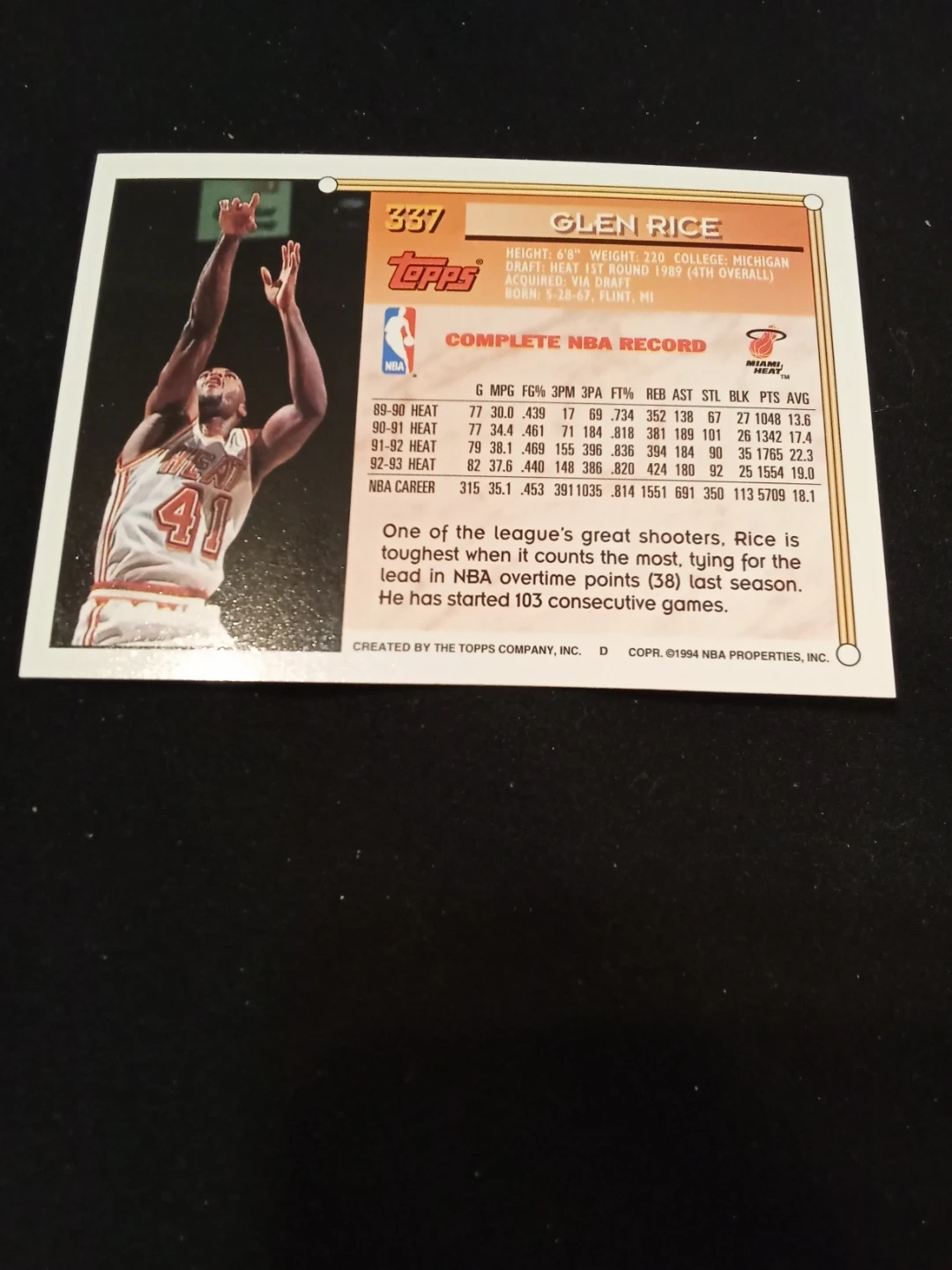 Selling a lot of two Topps 1994 NBA basketball cards featuring Glen Rice and Mike Gminski. These cards include complete player records and stats from their NBA careers. Copyright 1994.