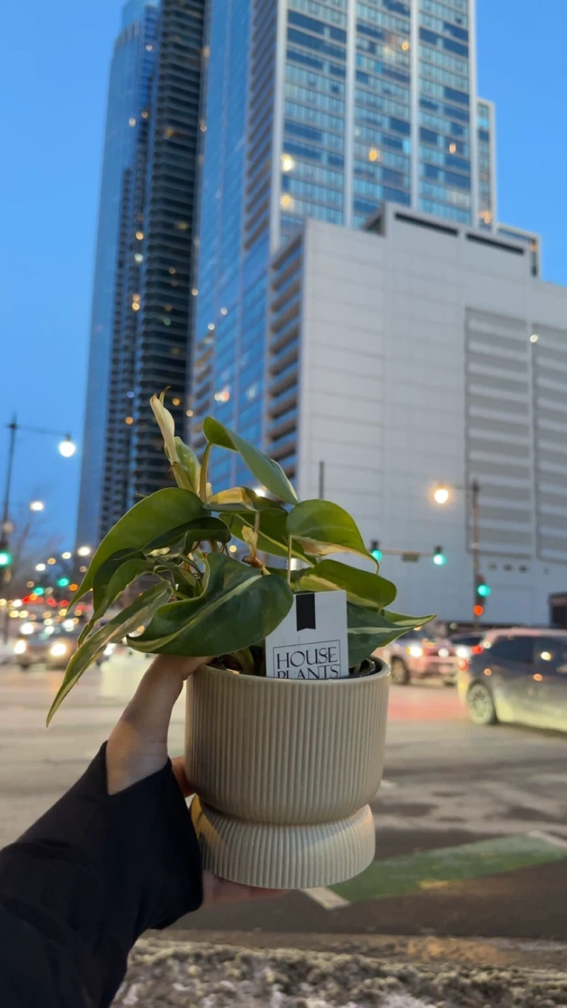 Healthy Philodendron Brasil house plant in a ribbed ceramic pot. It's a popular choice for adding a touch of green indoors! Comes with the pot.