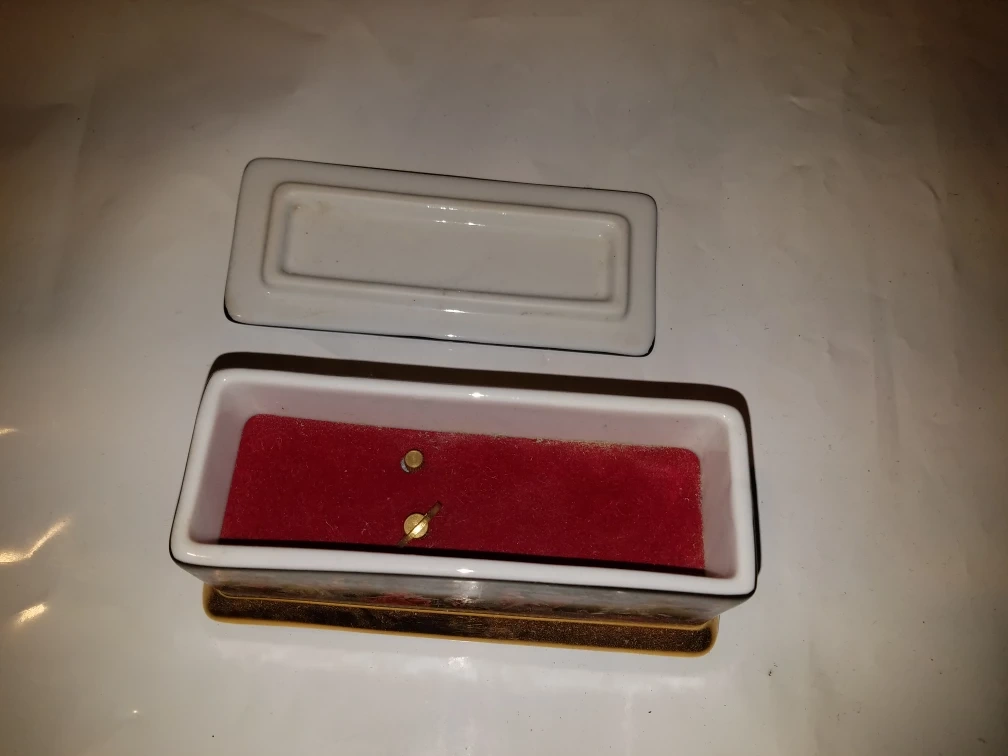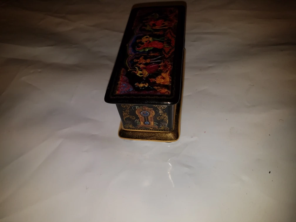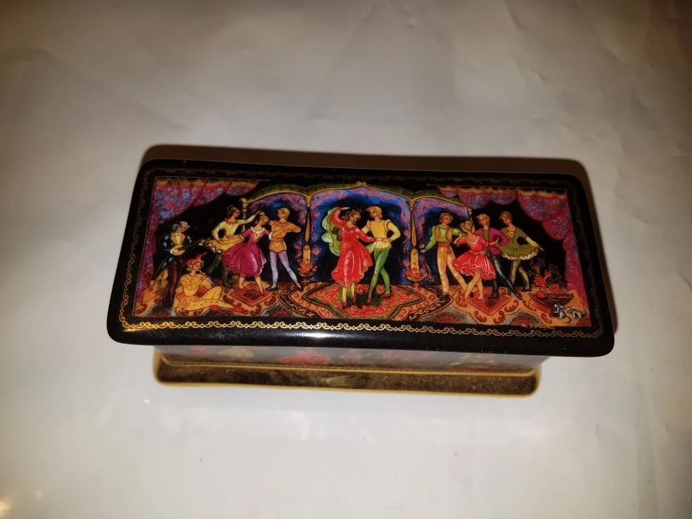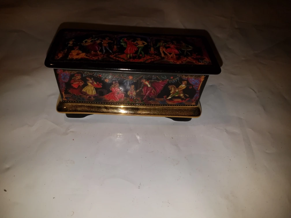 Offering a beautiful miniature box with a Russian Ballet theme! The box features a detailed scene of dancers and is adorned with gold accents. The bottom of the box has some Russian text and "© 1991 Hamilton Gifts & Sons". The inside is lined with red velvet and has two brass pins