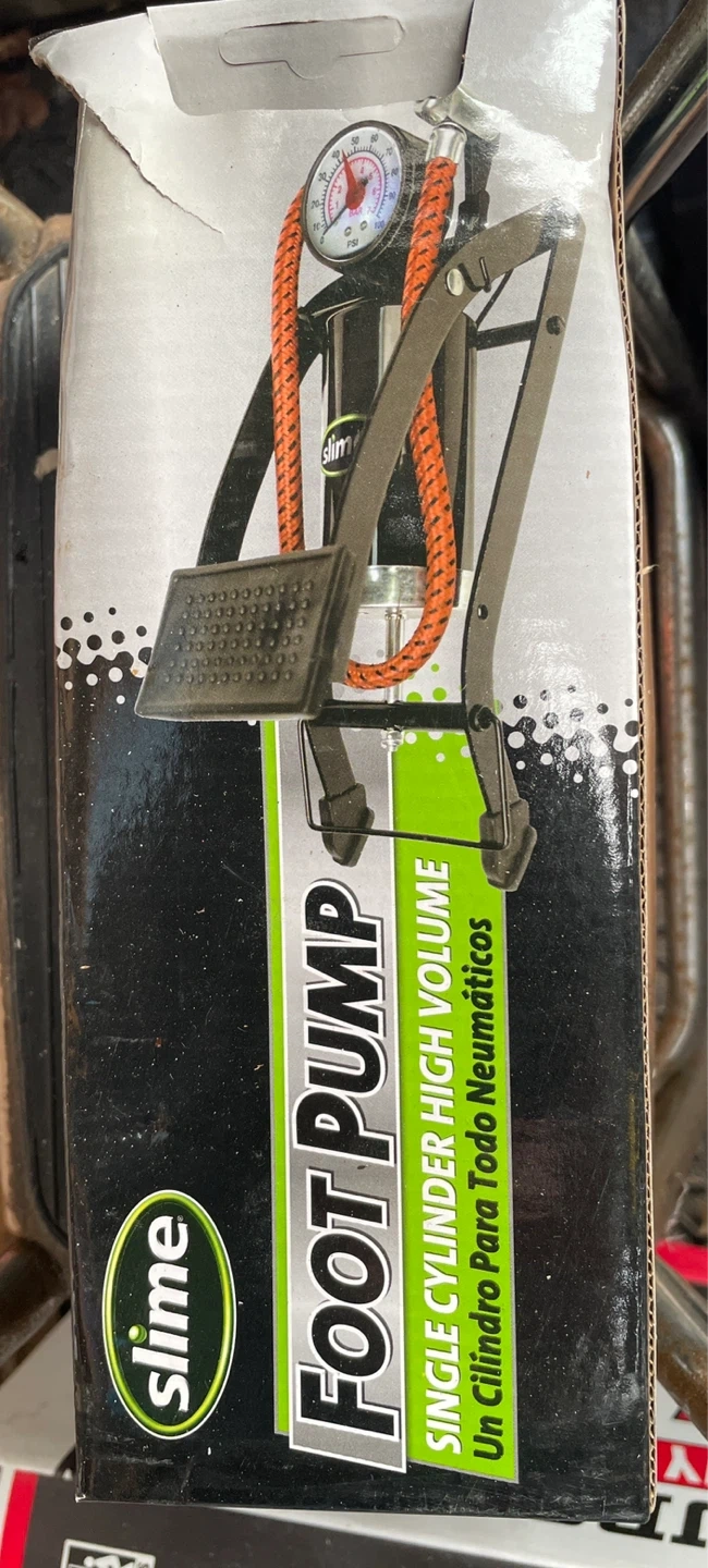 Selling a Slime Foot Pump, single cylinder high volume. It features fast and easy inflation with a quick connect and 20" air hose. It also has a pressure gauge with built-in PSI indicator and adapters included