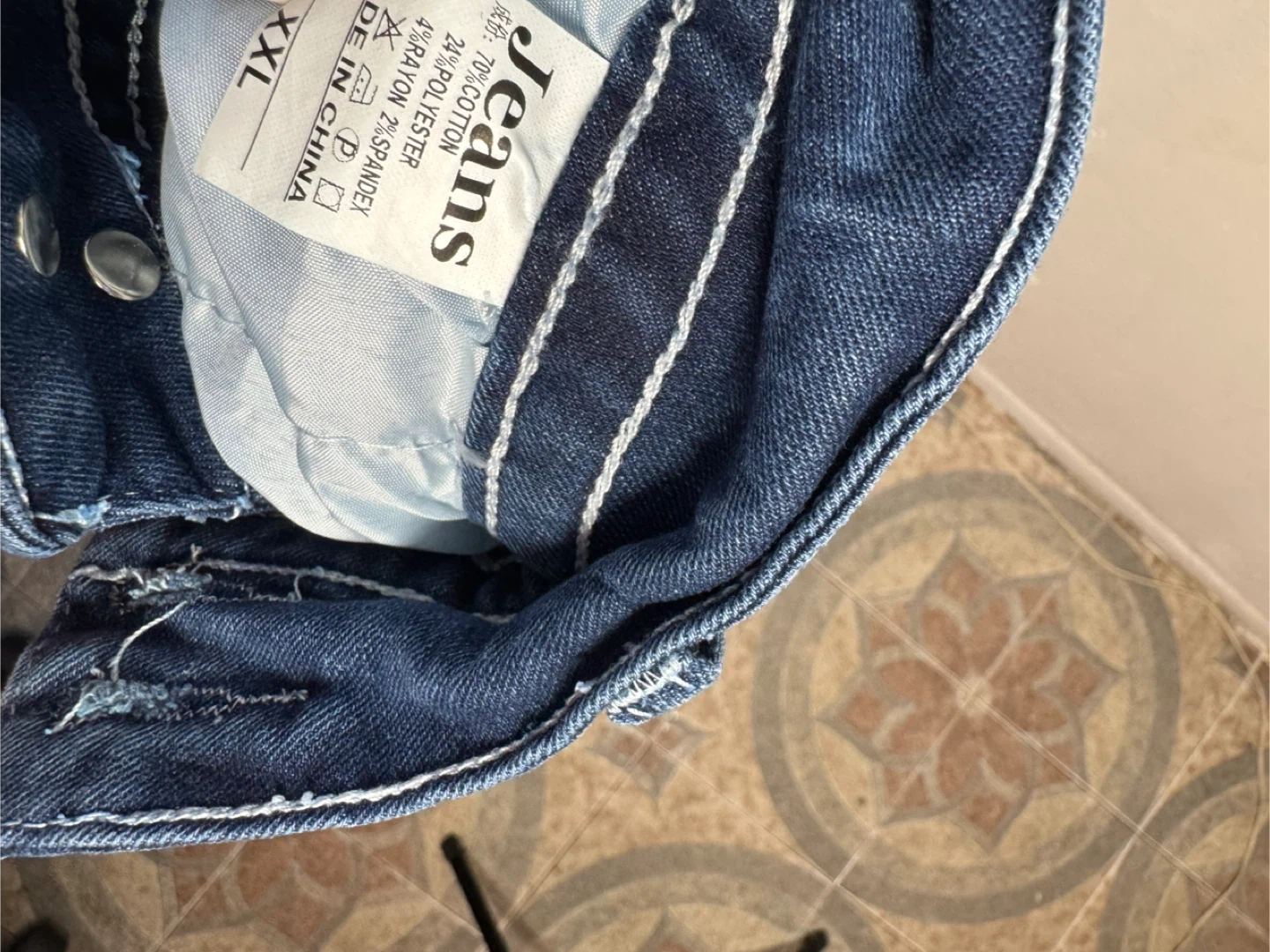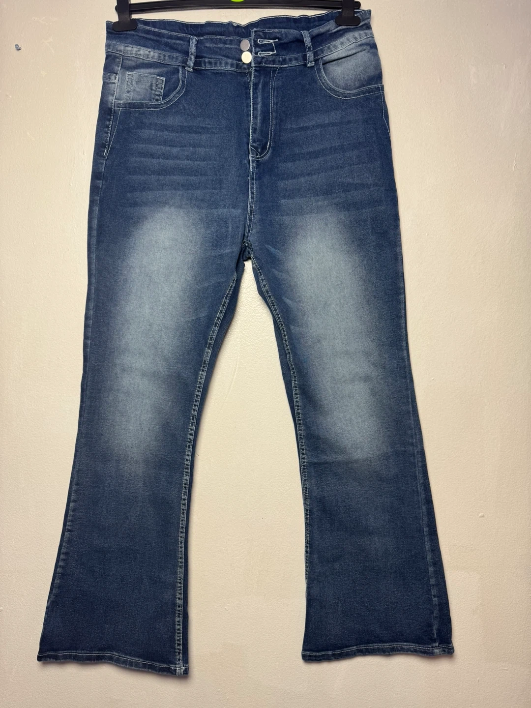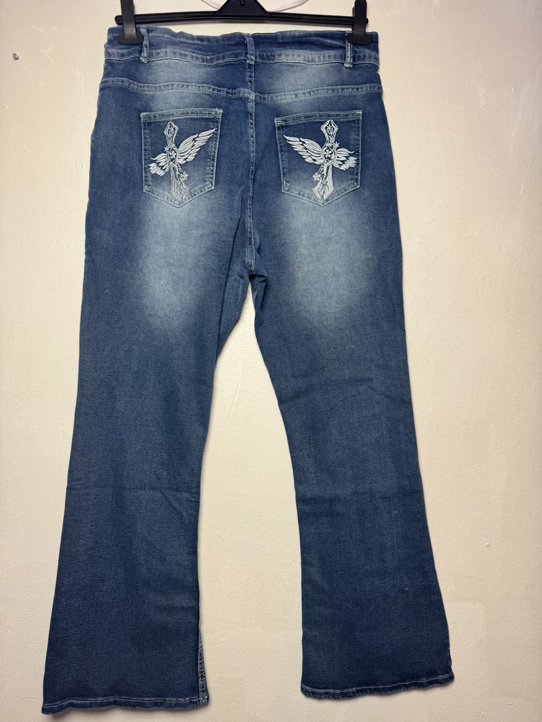 These are women's bootcut jeans in a dark wash. They're made of a cotton blend with 2% spandex for stretch. The back pockets have an embroidered design. Jeans are size XXL.