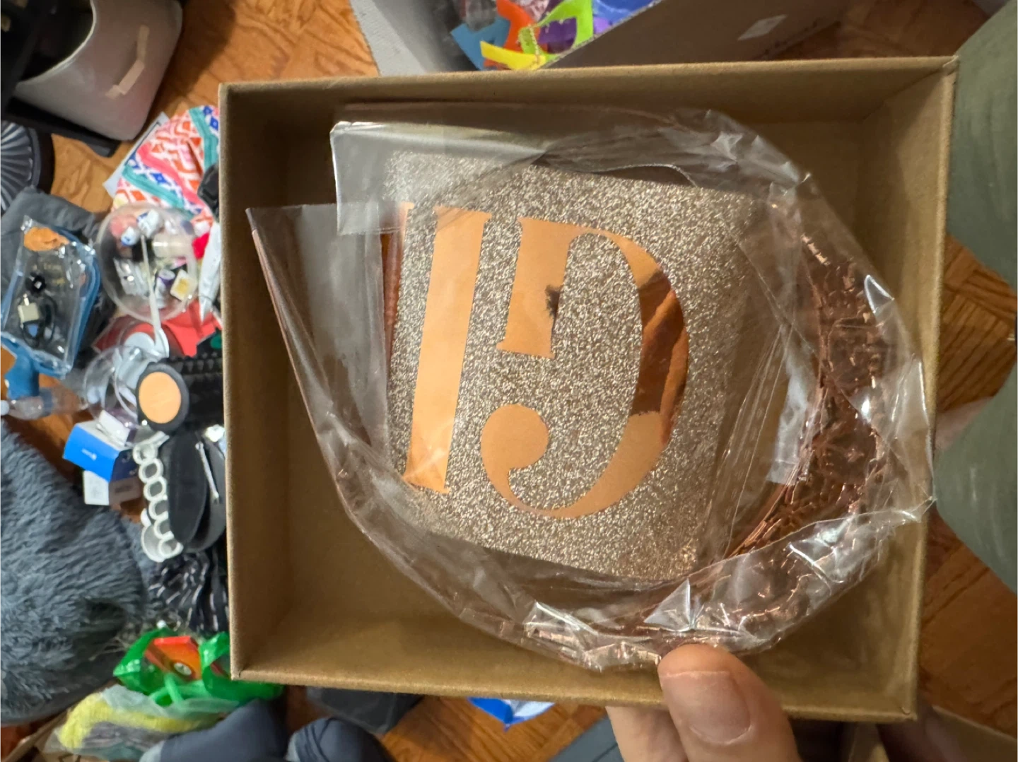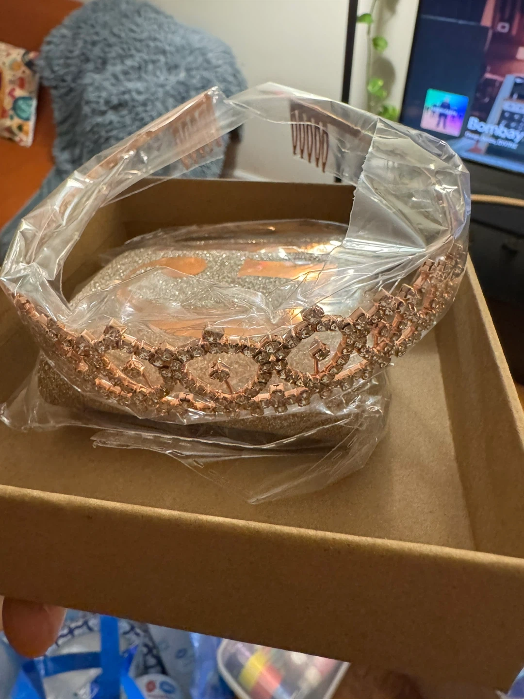 This set includes a rose gold shash and a birthday crown. The tiara is adorned with rhinestones for a sparkling look. It's perfect for a birthday celebration!