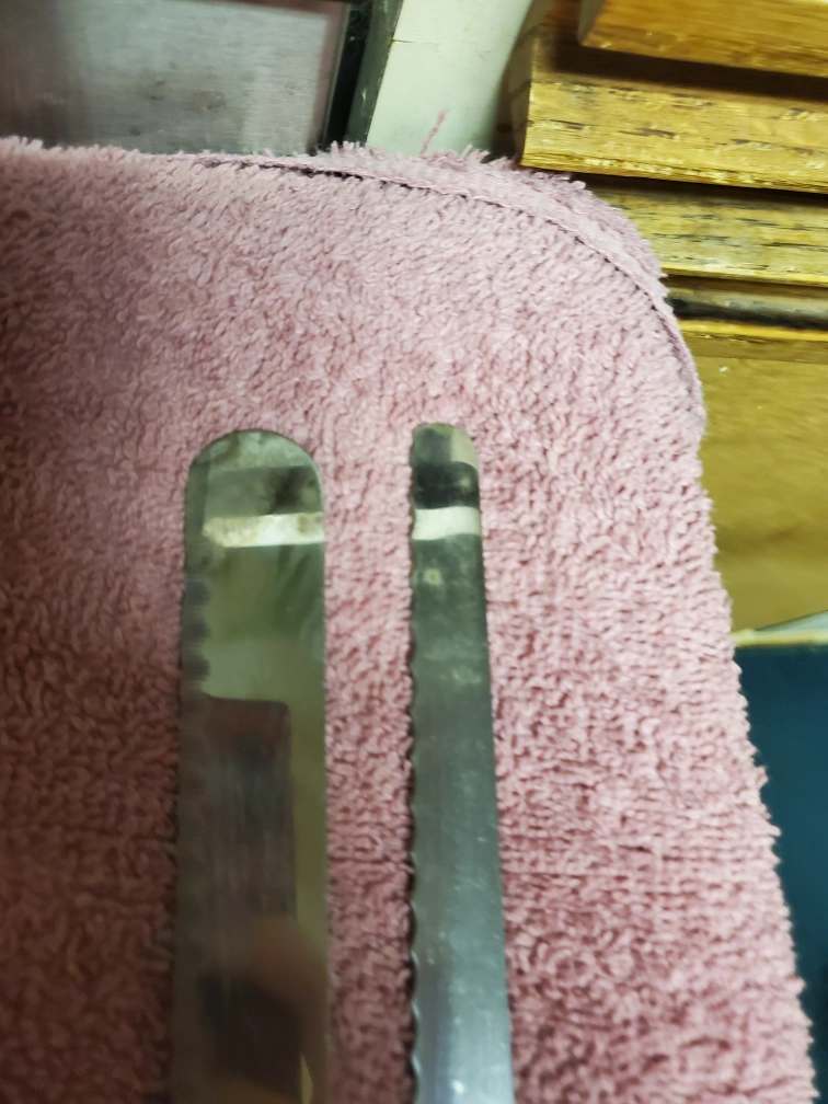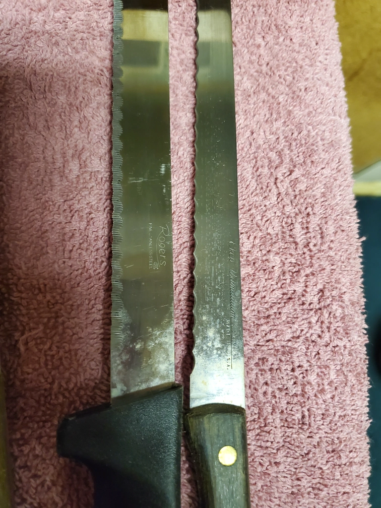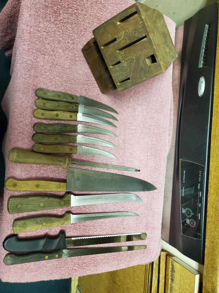 Selling a vintage knife set that includes a wooden block. The set has various knives, including some marked with 'Rogers' and 'Crisa Line'. The knives show signs of use and wear, but are still functional.