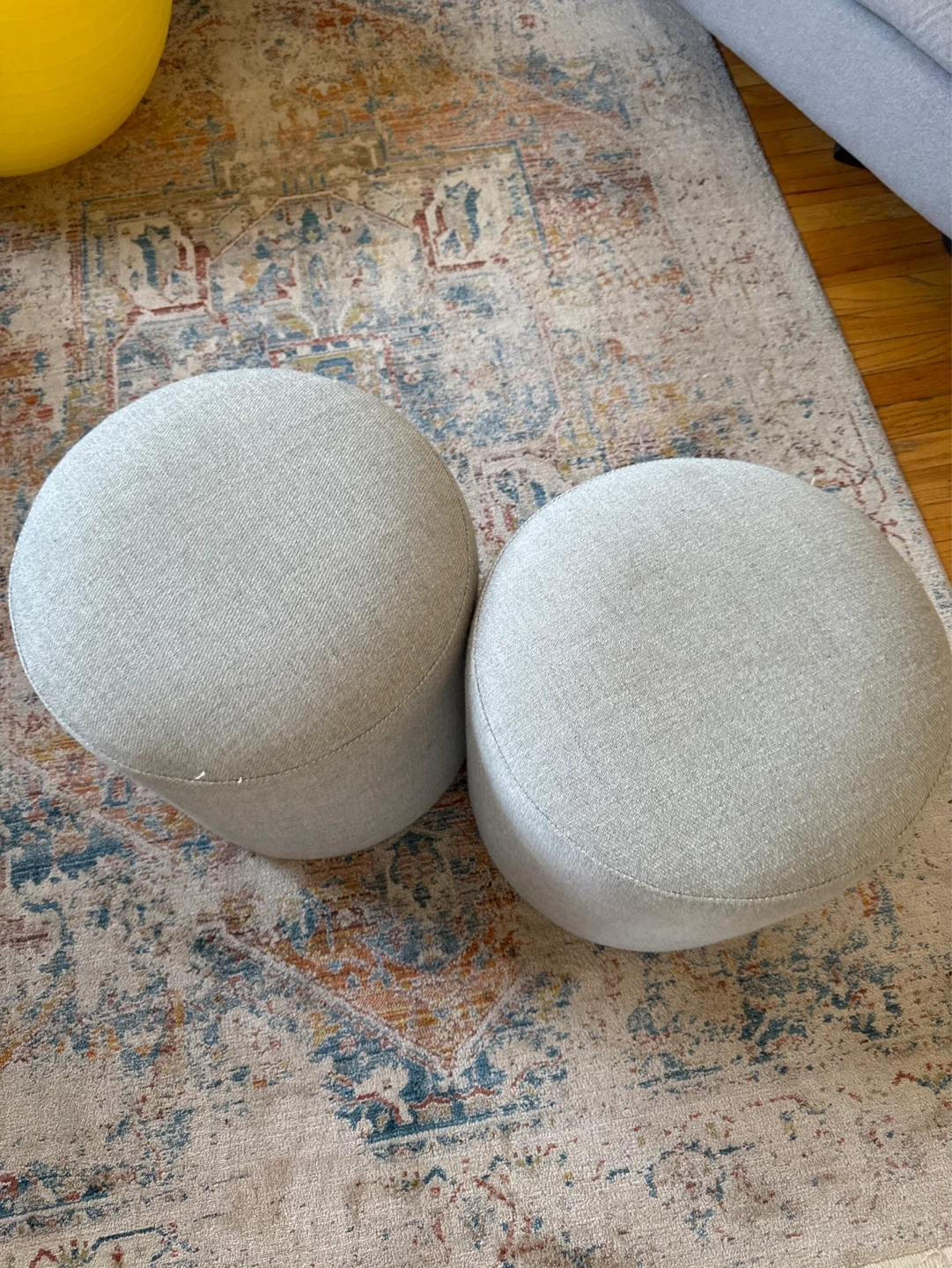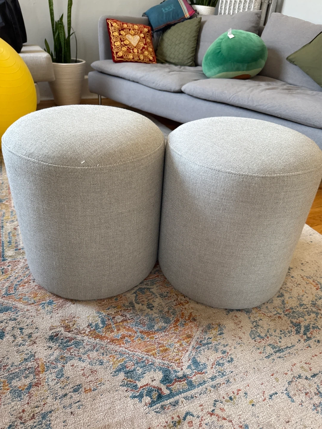 Set of two round pouf ottomans from West Elm. Upholstery made of polyester foam pad and polyurethane foam. They're a light gray color. These could be used as extra seating or footrests!