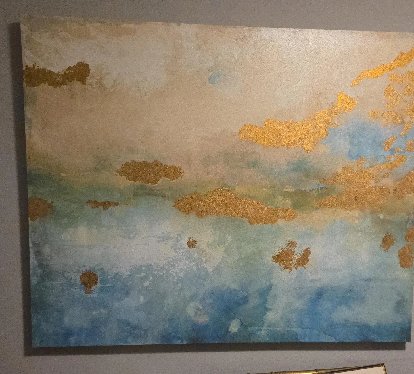 This abstract wall art features a watercolor-style background with textured gold leaf accents. It's a large canvas piece that adds a touch of elegance to any room. The color palette includes soft blues, greens, and beige tones.
