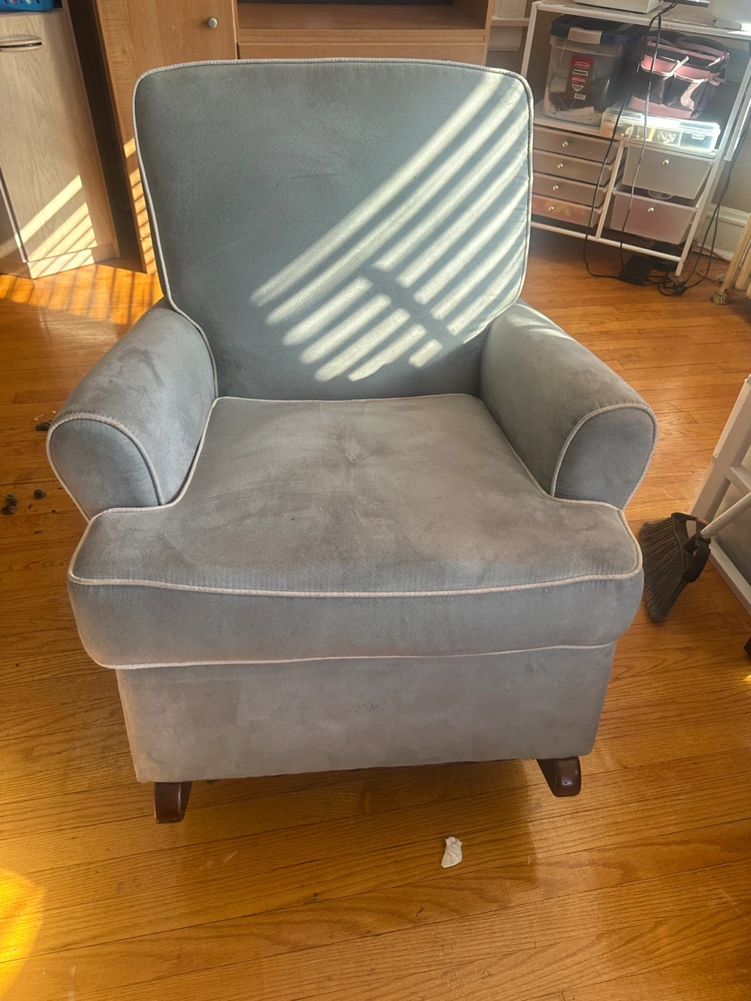 Comfortable grey upholstered glider rocking chair with subtle piping detail. Its wooden base and legs provide sturdy support. Perfect for a nursery or cozy reading nook!