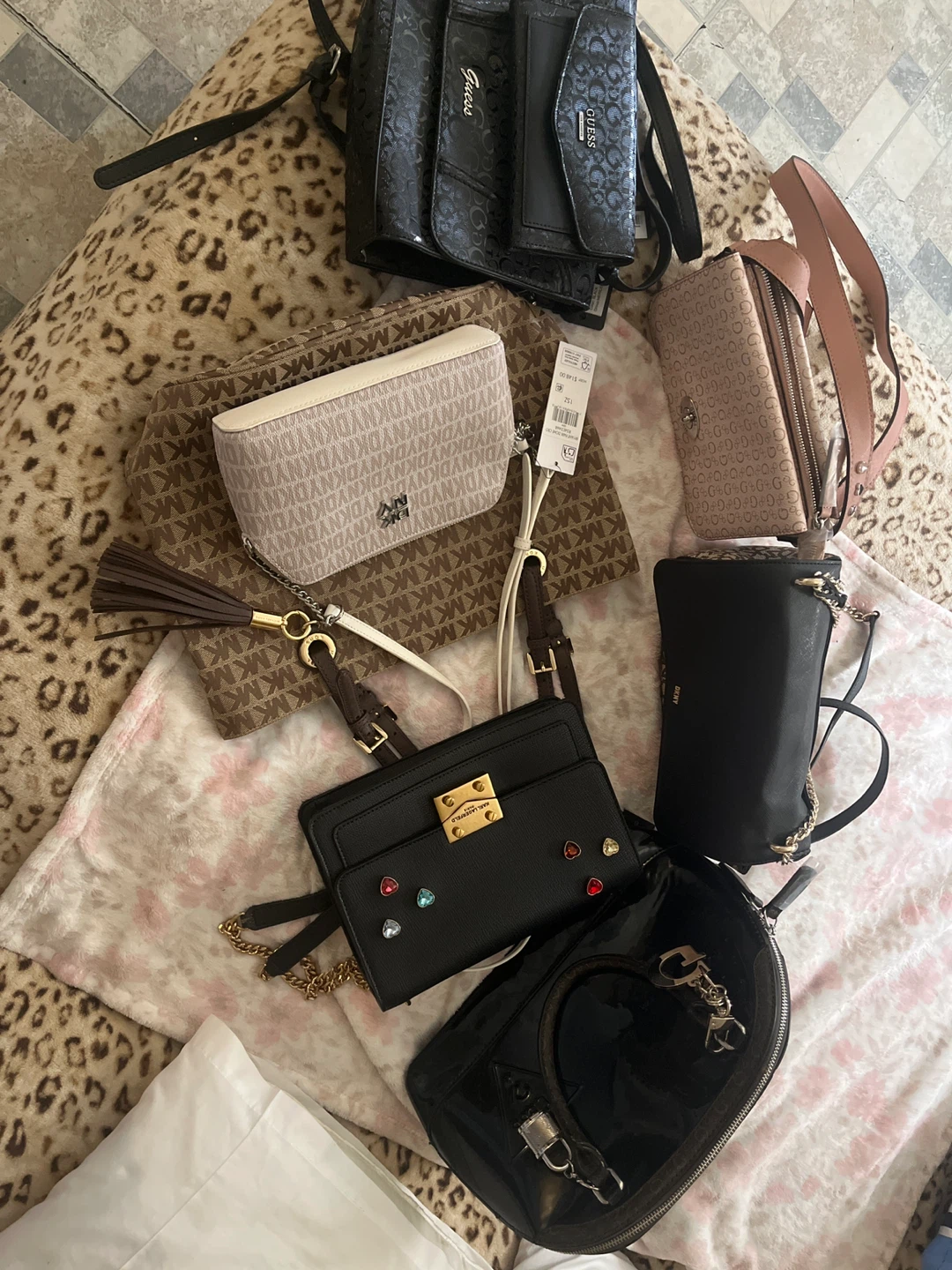This lot includes several designer accessories. You'll find a black Guess satchel with all-over logo print.