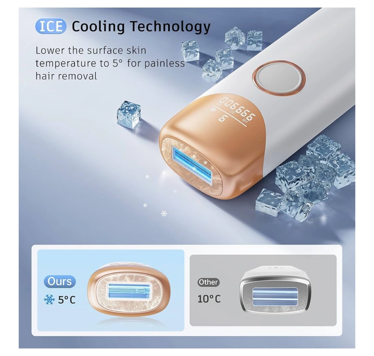 - ICE Cooling Technology: lowers the surface skin temperature to 5° for painless hair removal