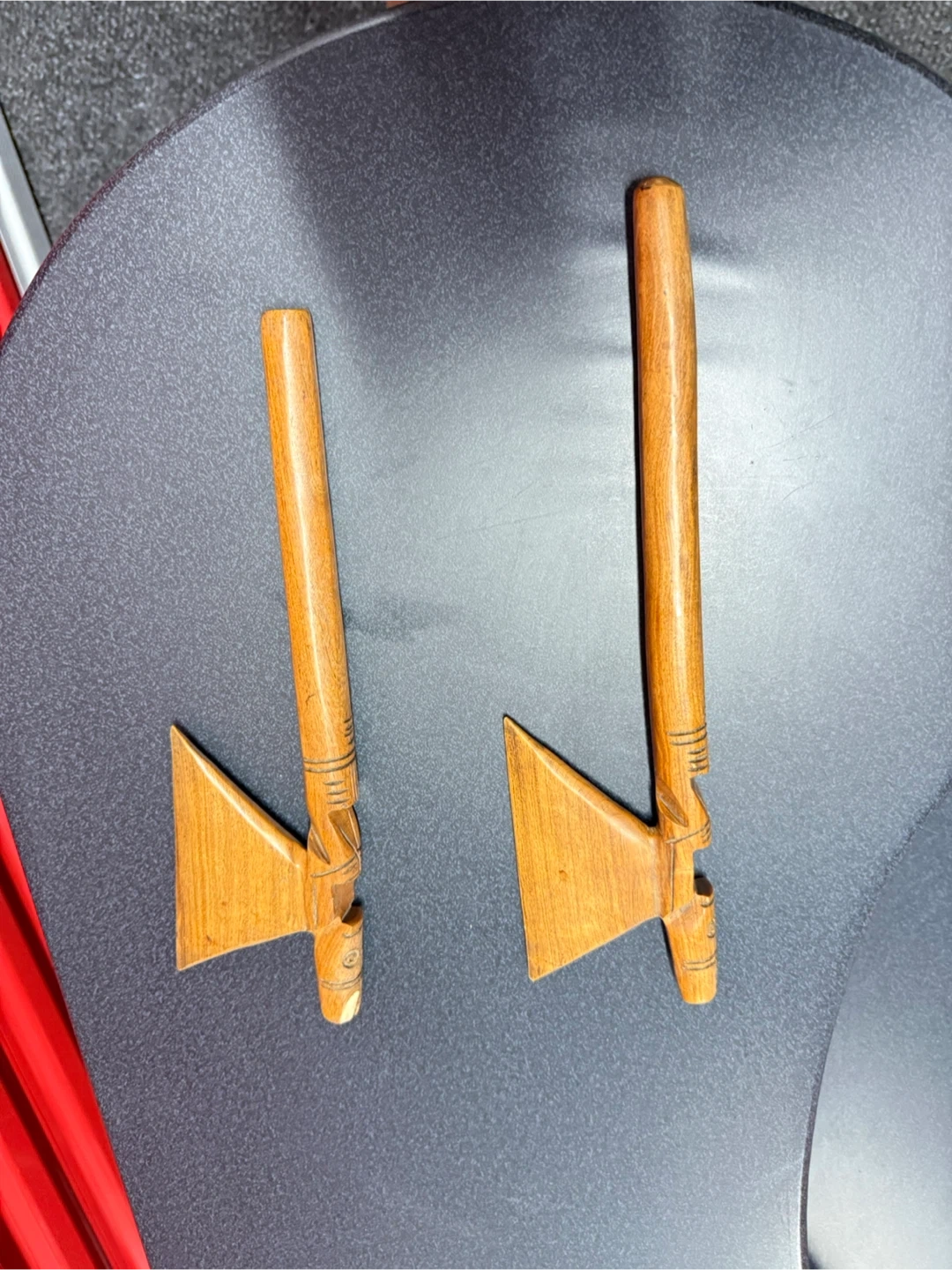 Set of two carved wooden chopsticks. Each chopstick features intricate carvings along the handle and a unique axe-shaped tip. They appear to be handcrafted with a natural wood finish.