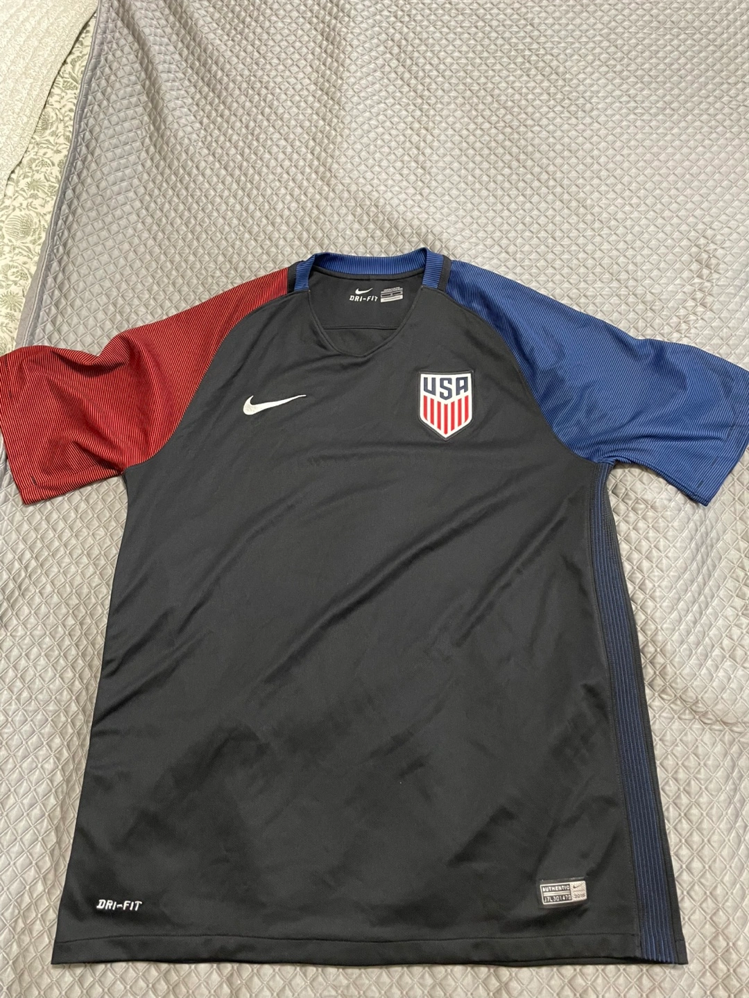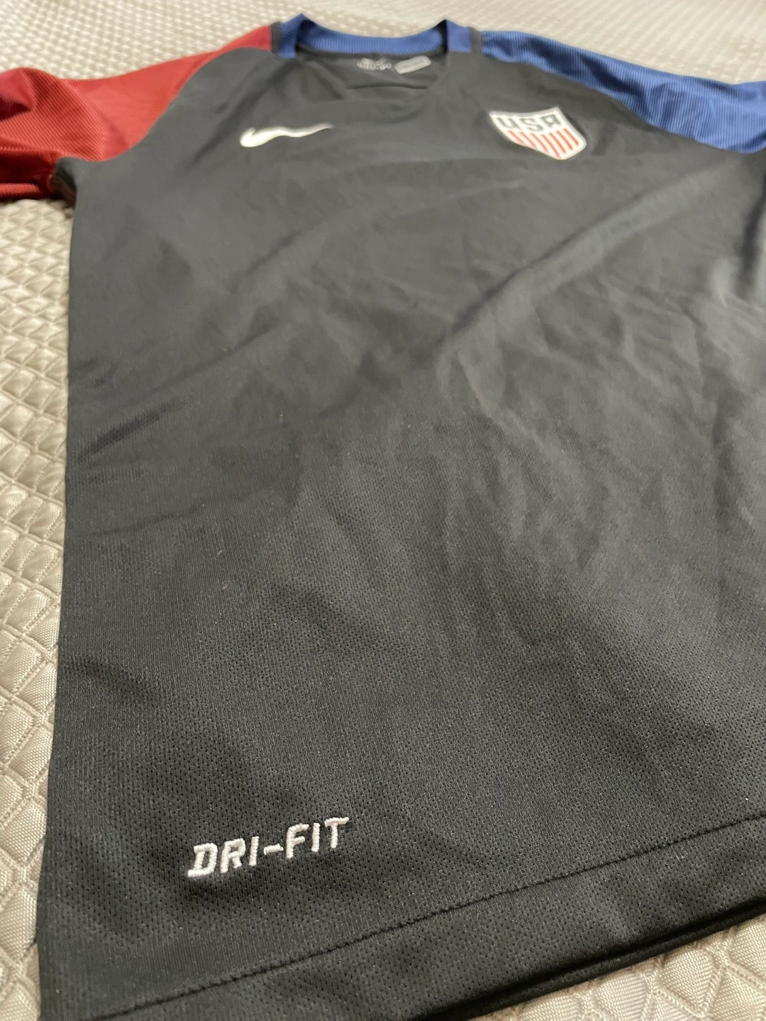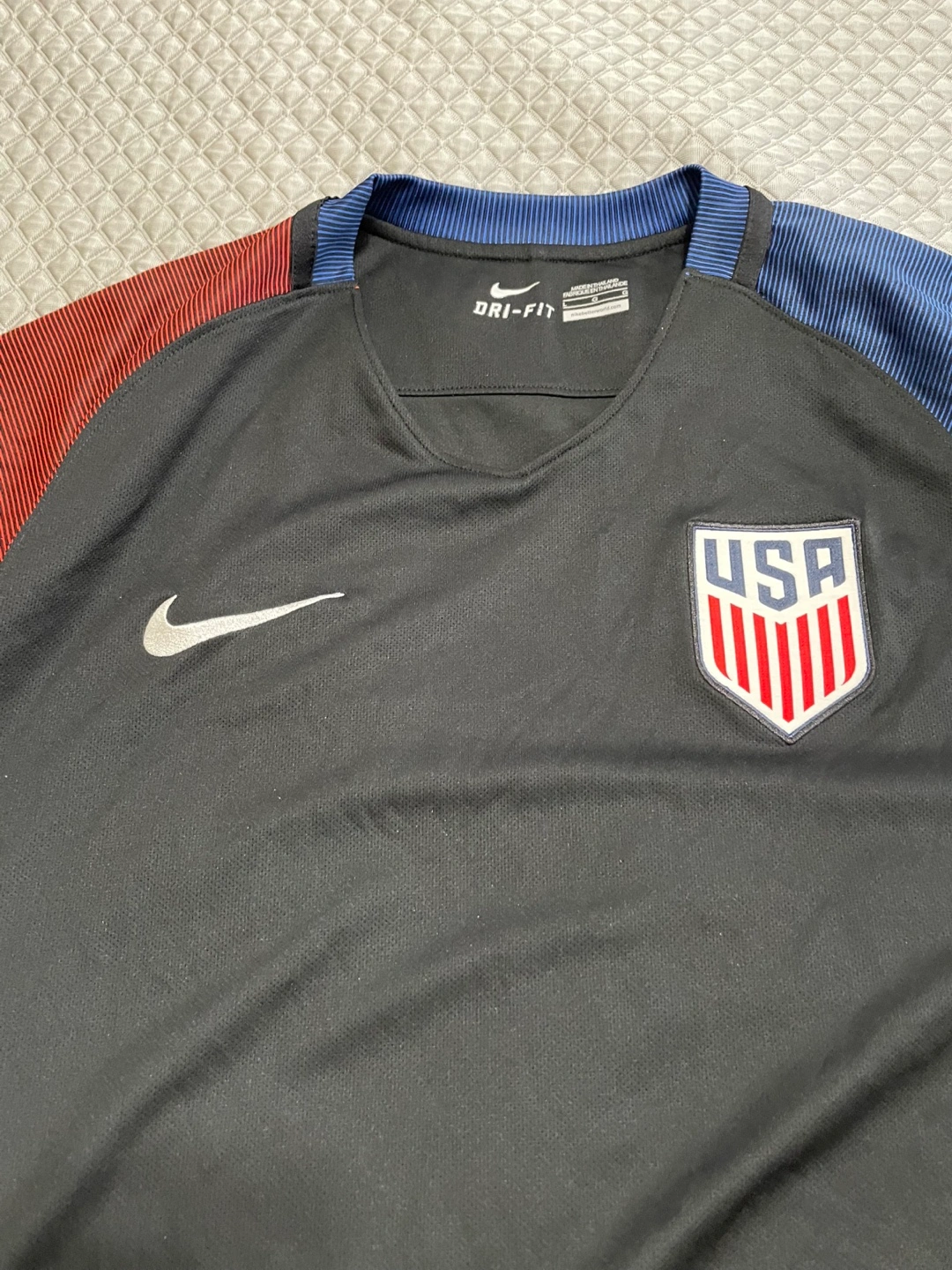 Men's Nike Dri-FIT soccer jersey. Black with red and blue accents. USA emblem on the chest. Size Large. Made in Thailand.