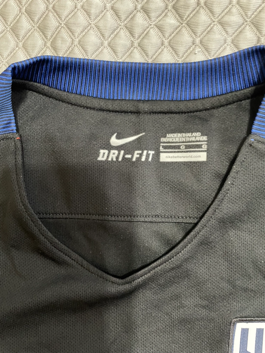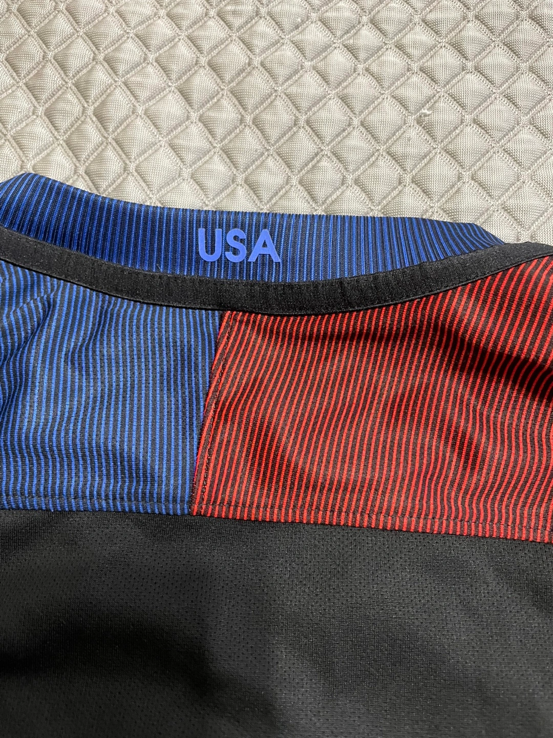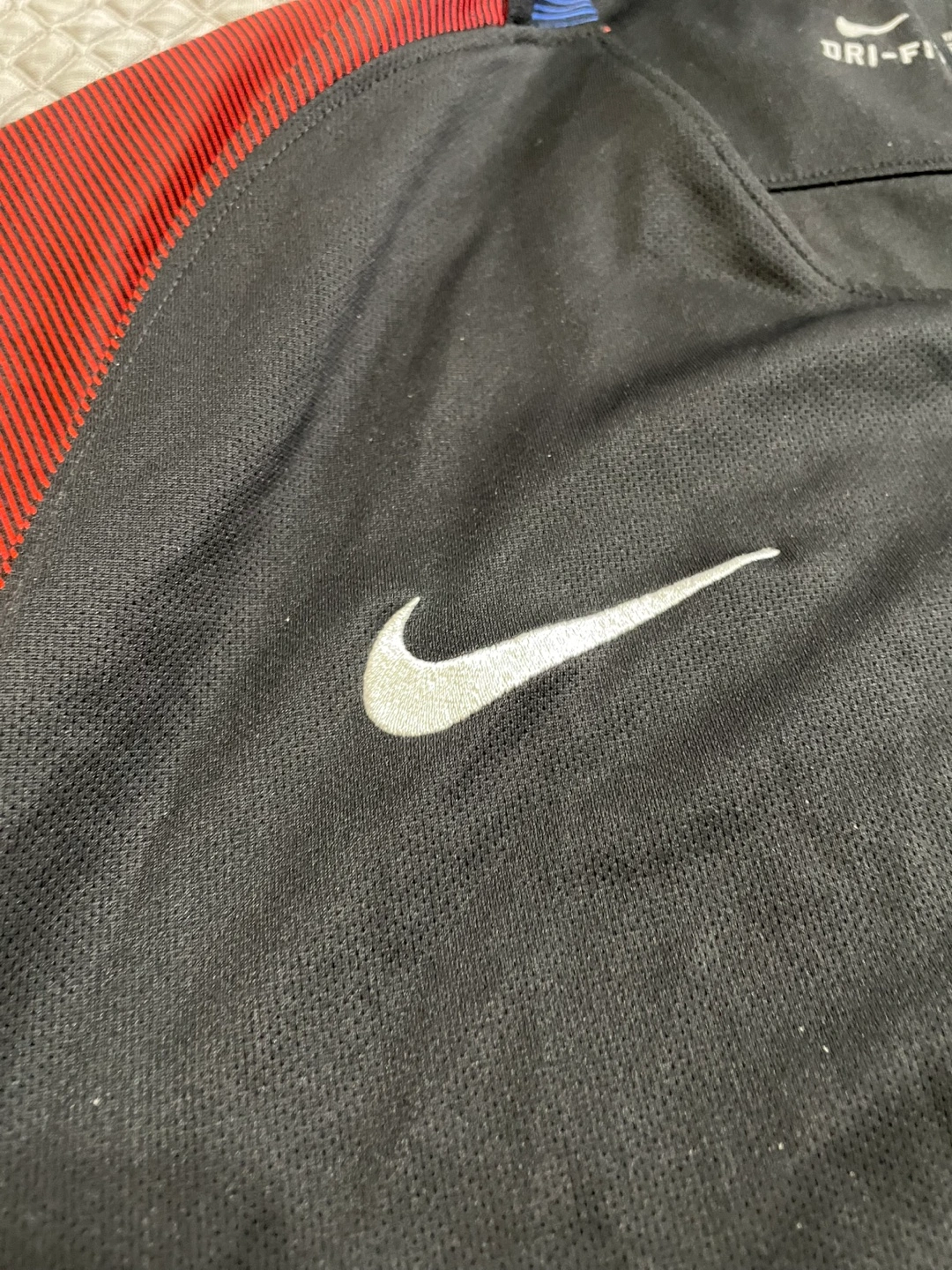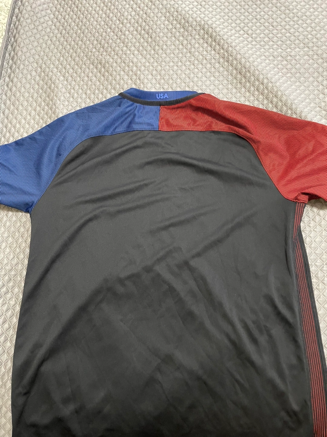 Men's Nike Dri-FIT soccer jersey. Black with red and blue accents. USA emblem on the chest. Size Large. Made in Thailand.