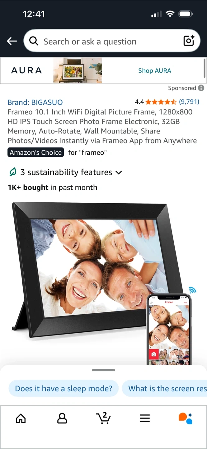 This BIGASUO digital picture frame has a 10.1-inch HD IPS touch screen. It features 32GB memory and auto-rotate capabilities. It's wall-mountable and can share photos and videos instantly via the Frameo App.