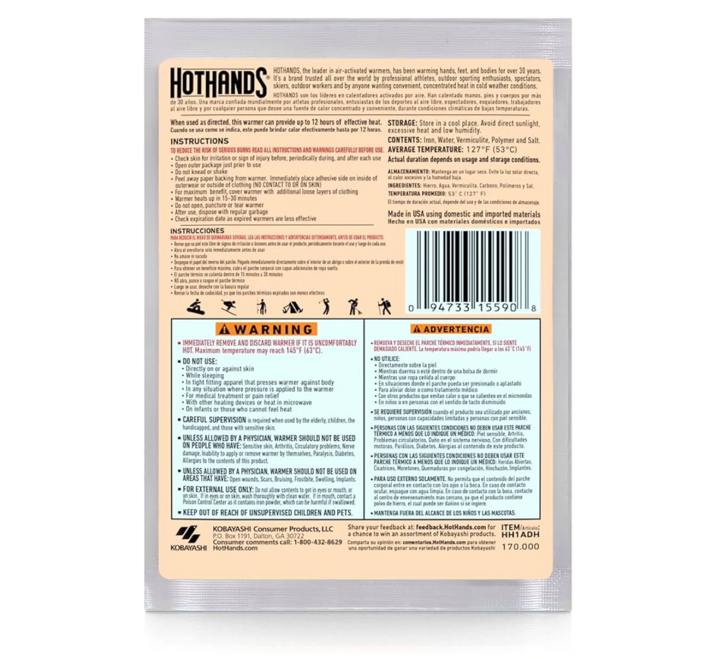 * NATURAL, LONG-LASTING HEAT - Each HotHands Adhesive Body Warmer is made with natural ingredients and lasts up to 12 hours when used as directed, which means you get 240 hours of soothing warmth. Perfect for your favorite activities, like tailgating, outdoor spectator sports, skiing, hunting, ice fishing and camping.