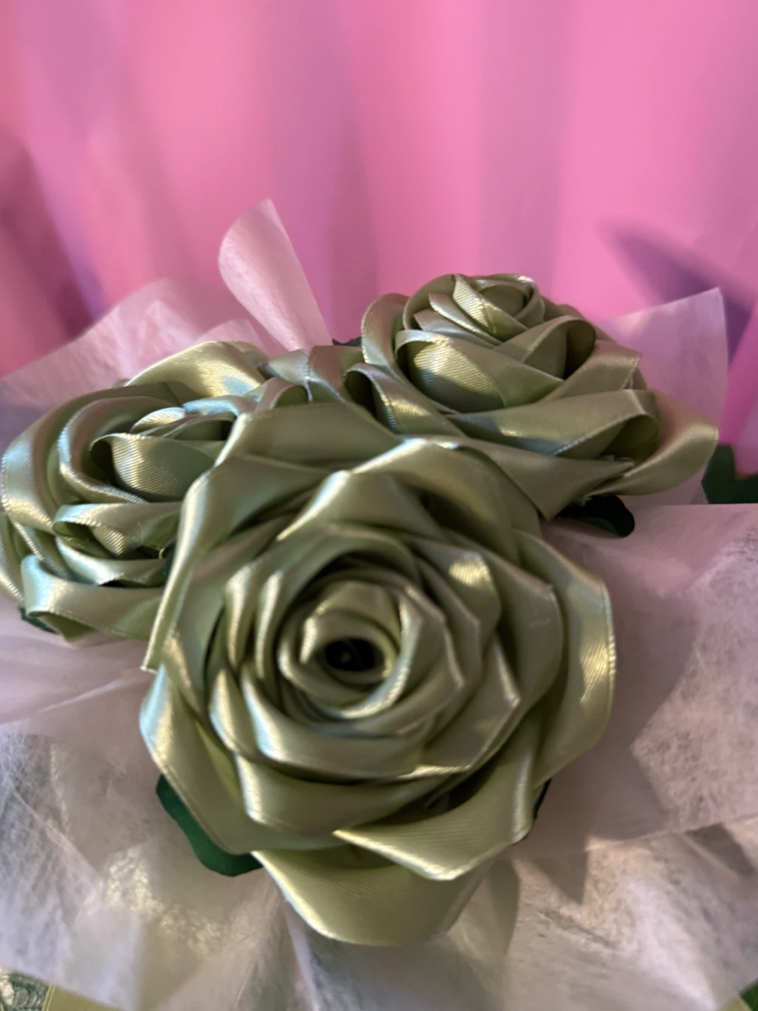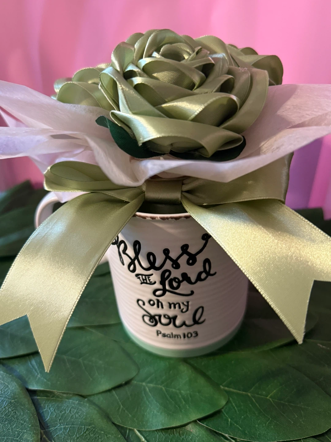 This charming arrangement features three sage green satin ribbon roses nestled in tissue paper and a decorative mug. The mug has "Bless the Lord oh my Soul" and "Psalm 103" printed on it. It's tied with a satin ribbon, making it a lovely decorative piece.