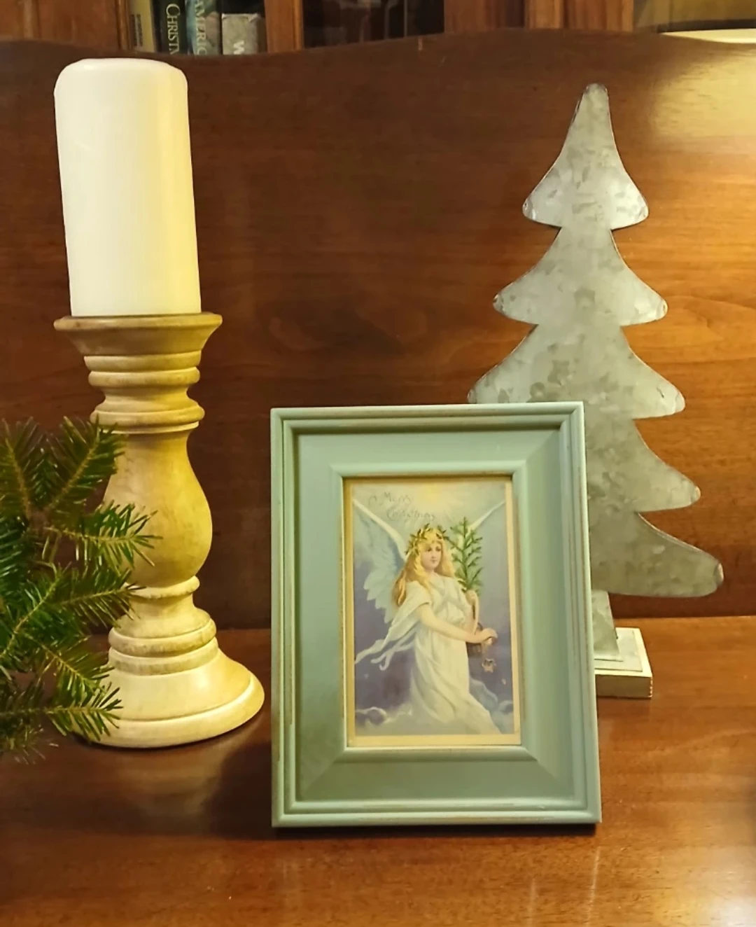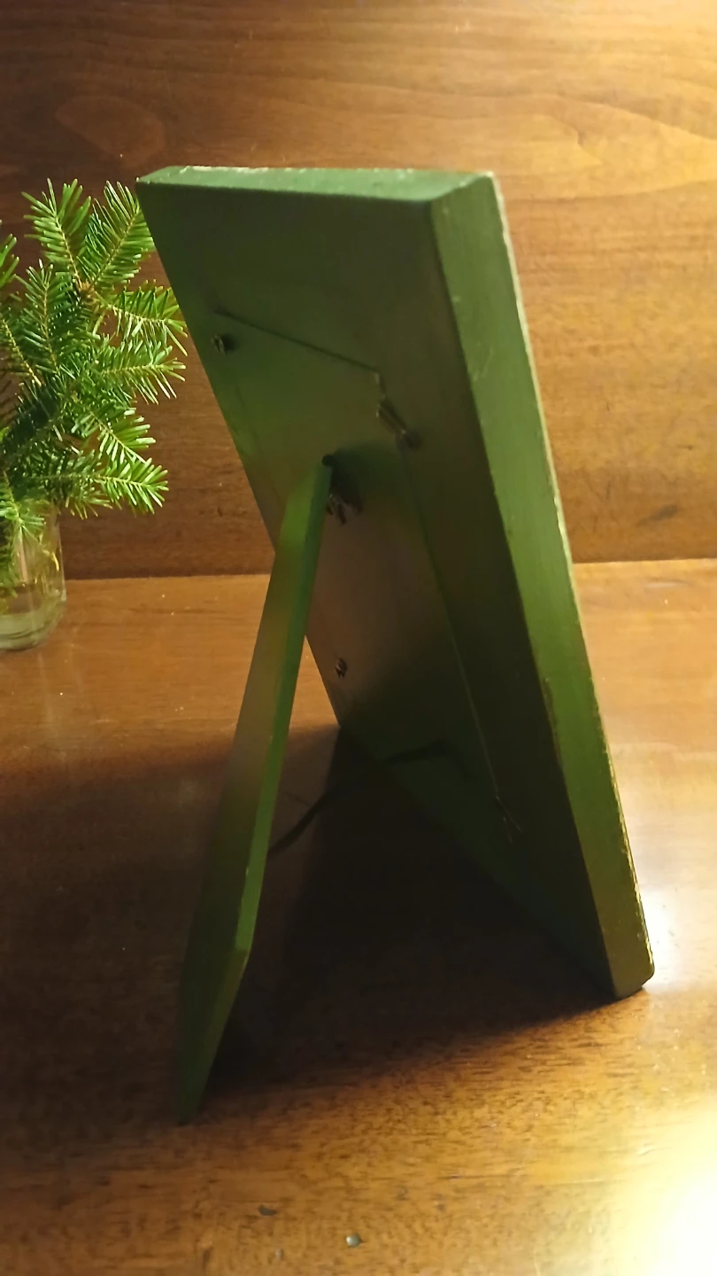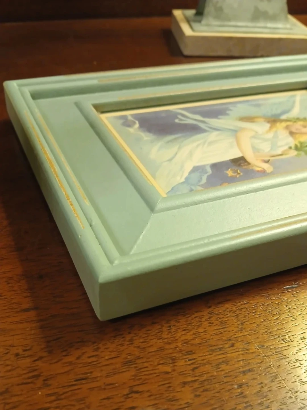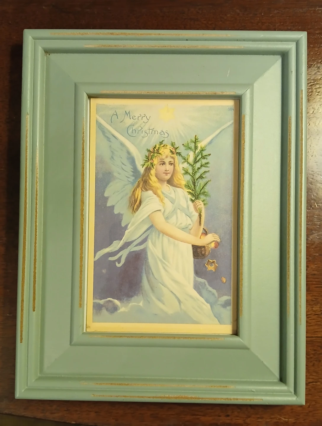 Distressed painted turquoise wooden frame with vintage angel print. Buy for the holiday and change the beautiful angel to one of your own photos or other artwork when the Xmas decorations have come down.