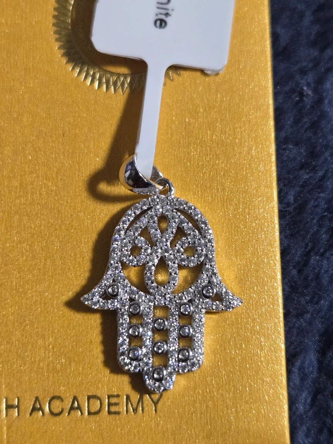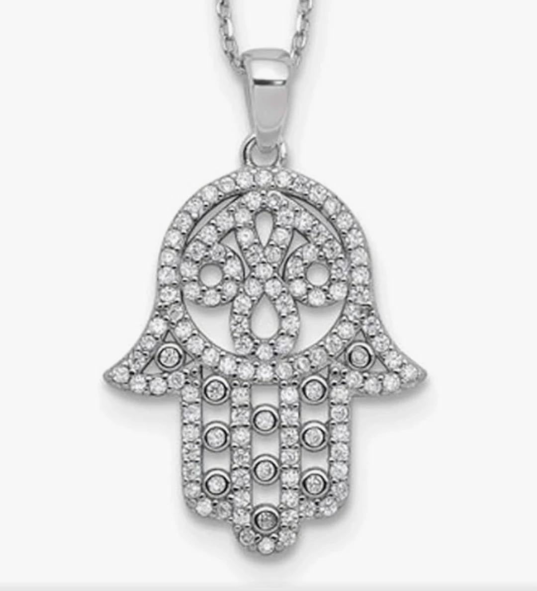 Selling a beautiful Moissanite Hamsa pendant necklace. The pendant features round 1mm, 0.65CT Moissanite stones. The box indicates an MSRP of $314.99. It's new and ready to wear!