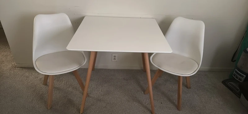 Compact white dining set featuring a square table and two matching chairs. The table has a smooth, easy-to-clean surface. Chairs have a modern design with wooden legs. It's a great setup for small spaces. Table is white plastic and wood. Chairs are white plastic with wooden legs.