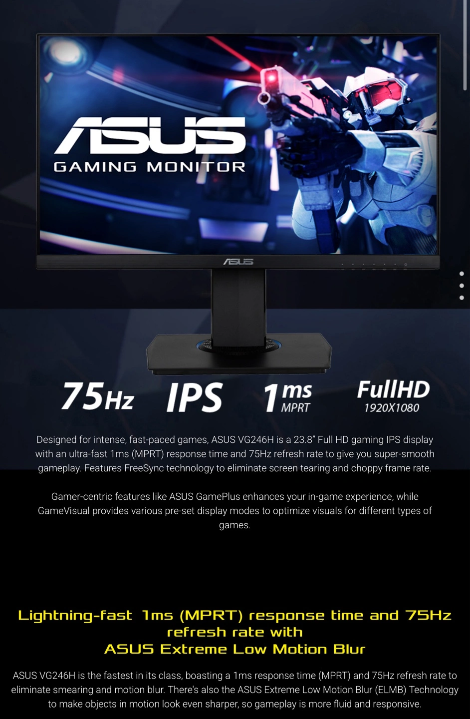 ASUS VG246H Gaming Monitor – 23.8 inch Full HD (1920 x 1080), IPS, 75Hz, 1ms MPRT, Extreme Low Motion Blur™, FreeSync™, Ergonomic Design