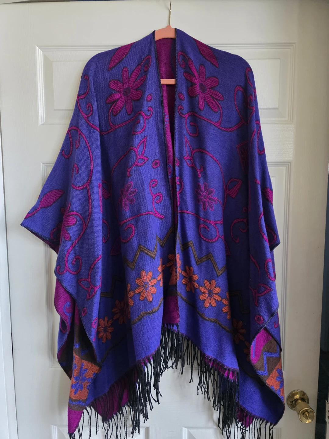 This reversible poncho features a vibrant purple base with a pink floral and vine pattern. The hem has a coordinating pink and orange floral design with a zigzag border and black fringe. It's a stylish way to add a pop of color and warmth!