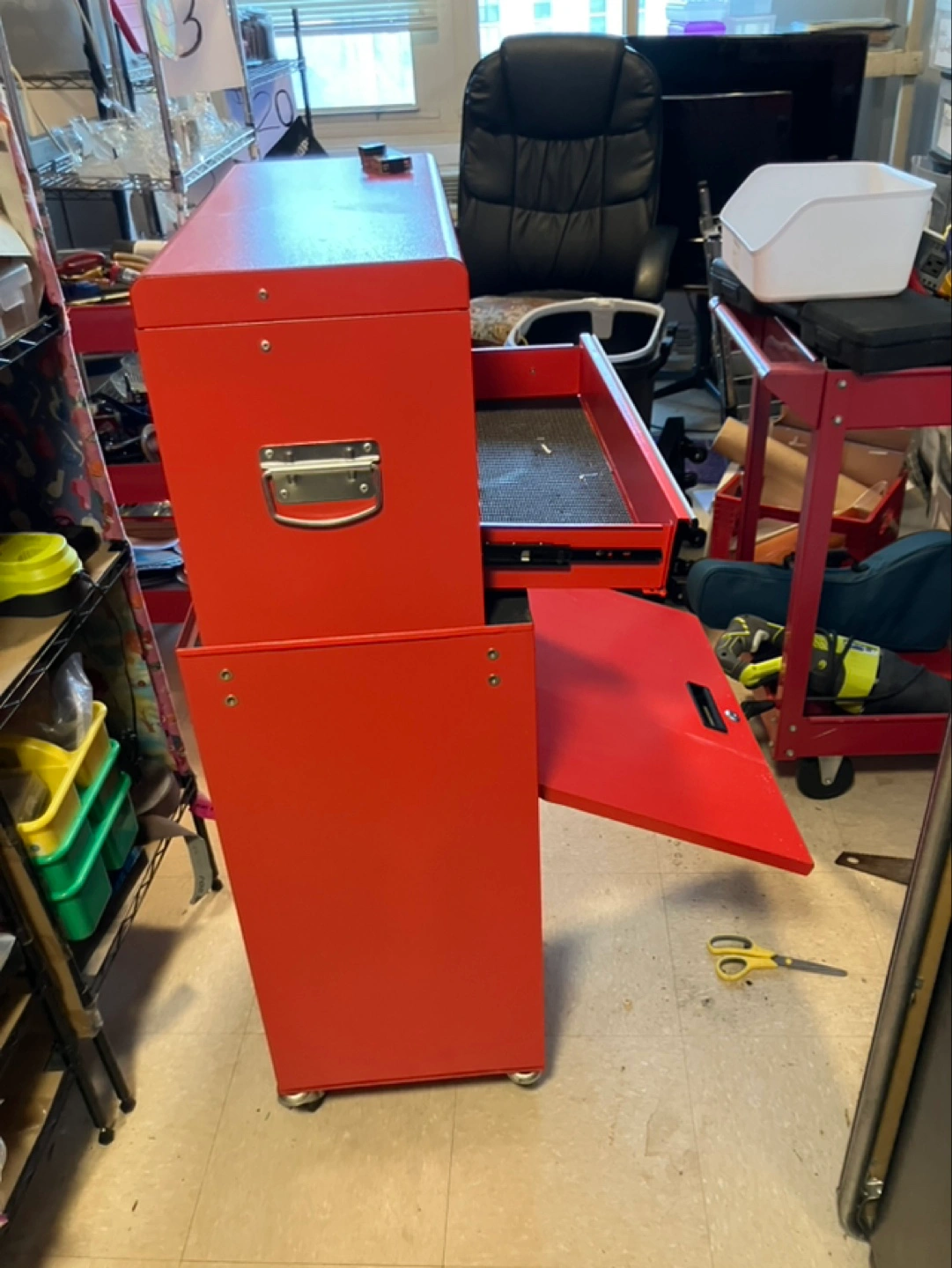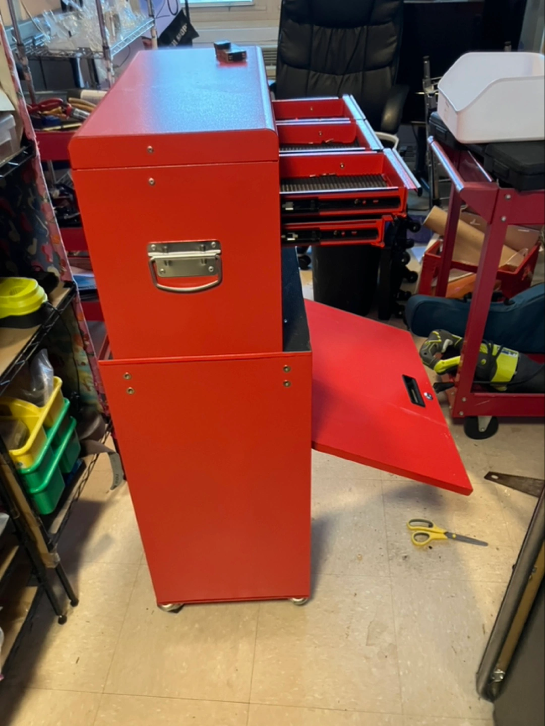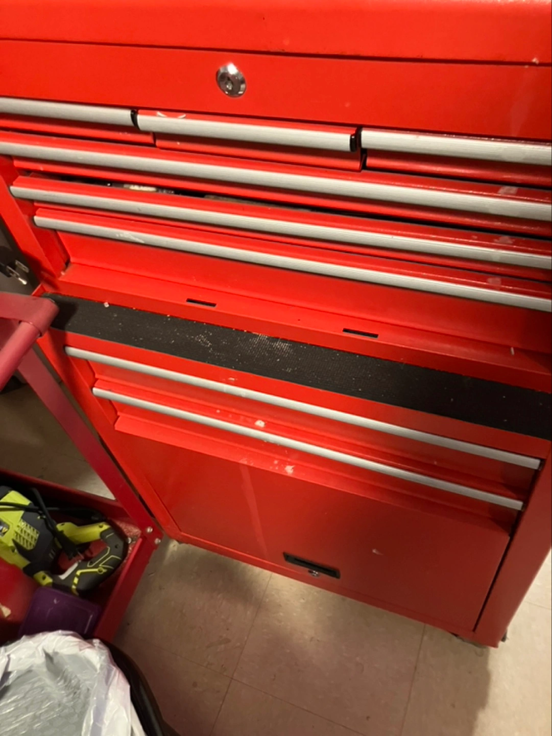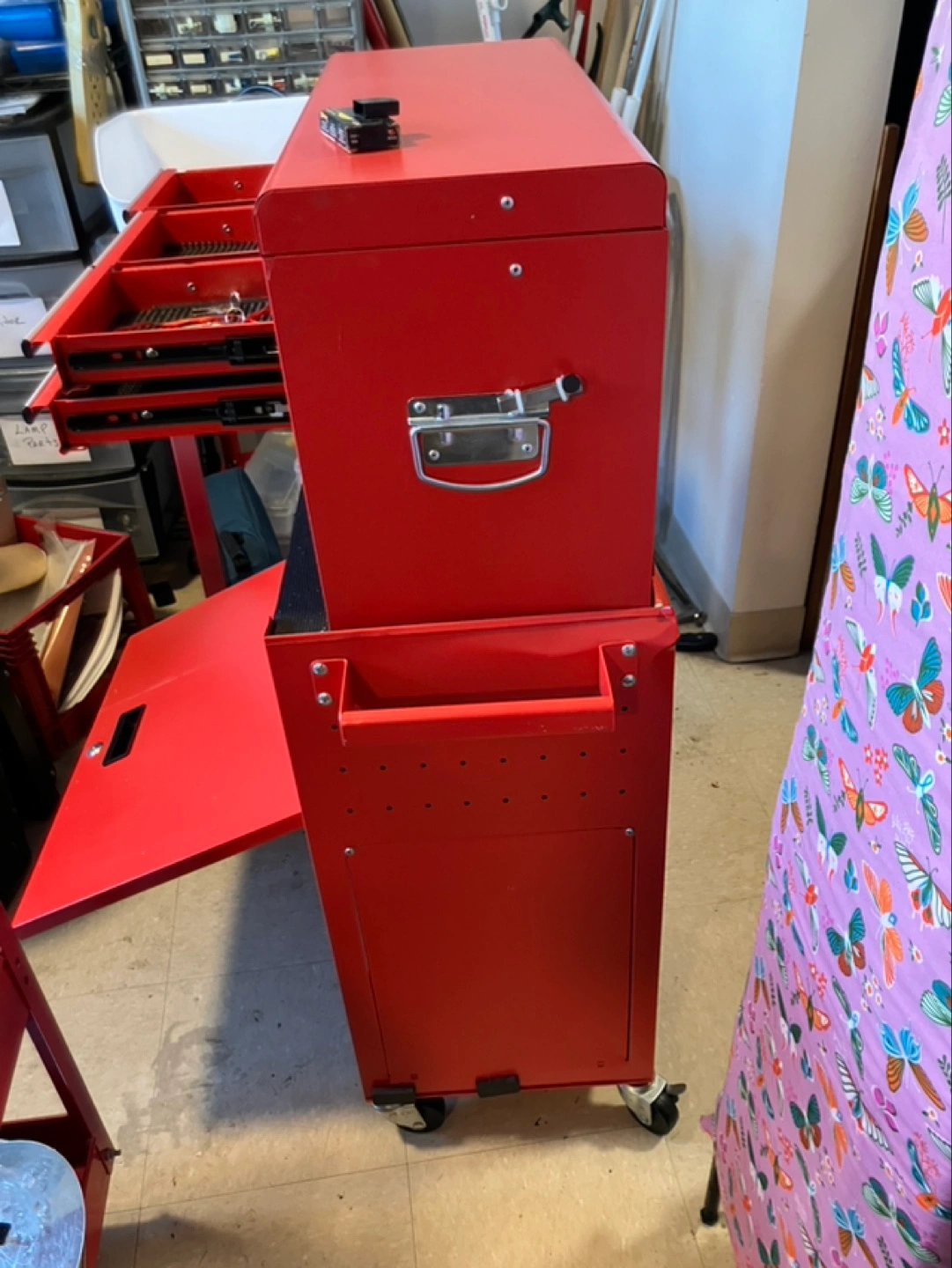 Multi-drawer rolling tool cabinet. Red metal construction. Several drawers of varying sizes. Shows some minor wear. The bottom slide planks doesn’t slide in all the way revealing the bottom shelf