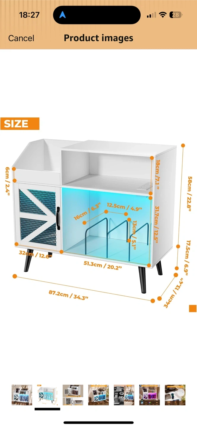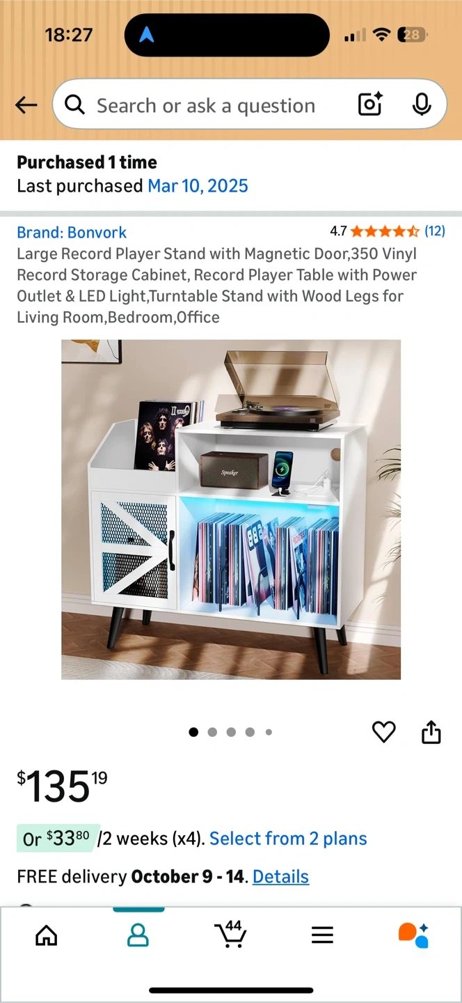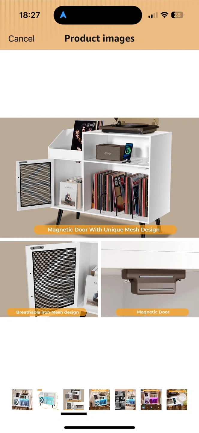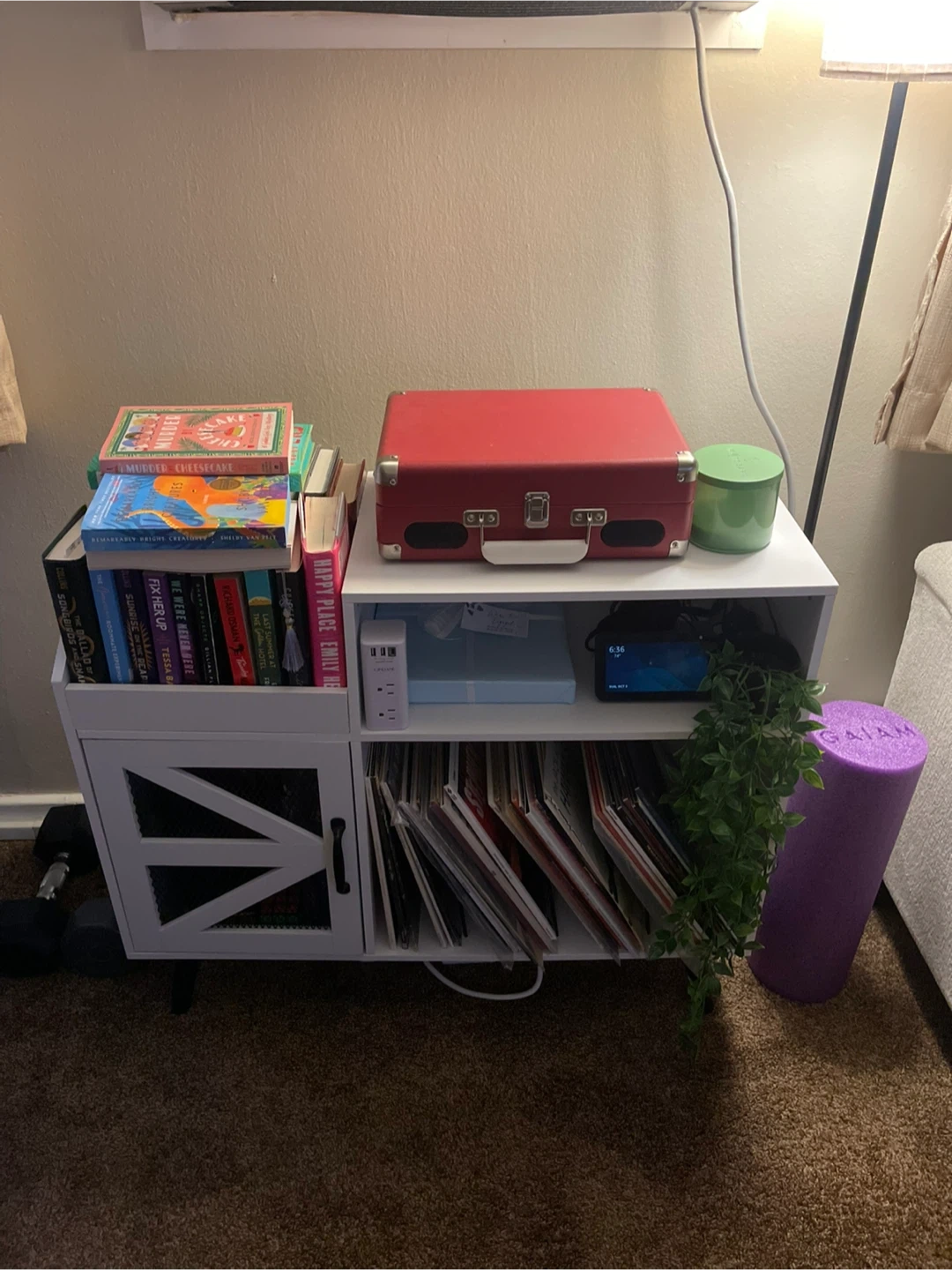 Selling a large Bonvork record player stand with a magnetic door. It features a 350 Vinyl Record Storage Cabinet, Record Player Table with Power Outlet & LED Light, and Turntable Stand with Wood Legs.