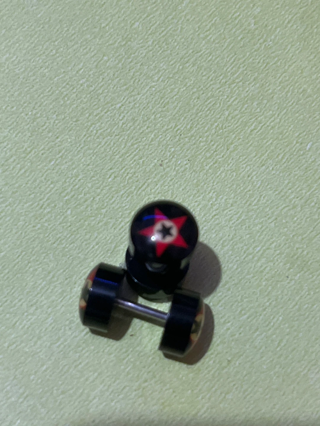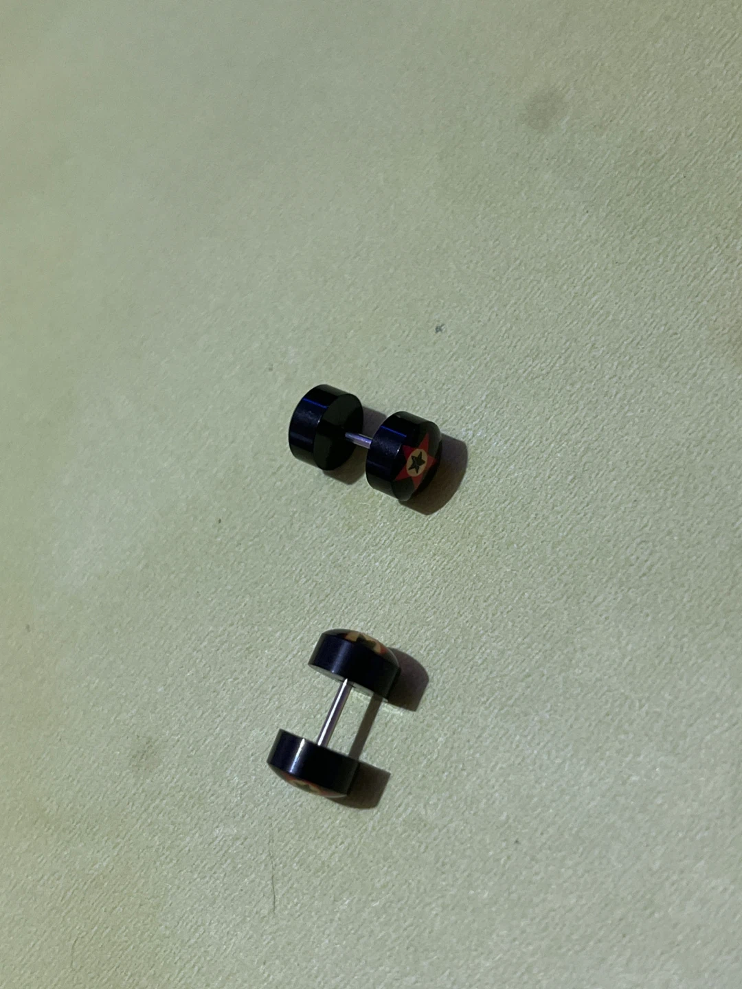 This is a pair of black ear gauges with a red star design. They're made of metal and include a silver-tone post. These gauge earrings are suitable for stretched ear piercings.