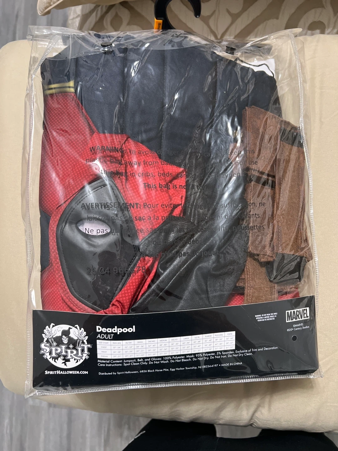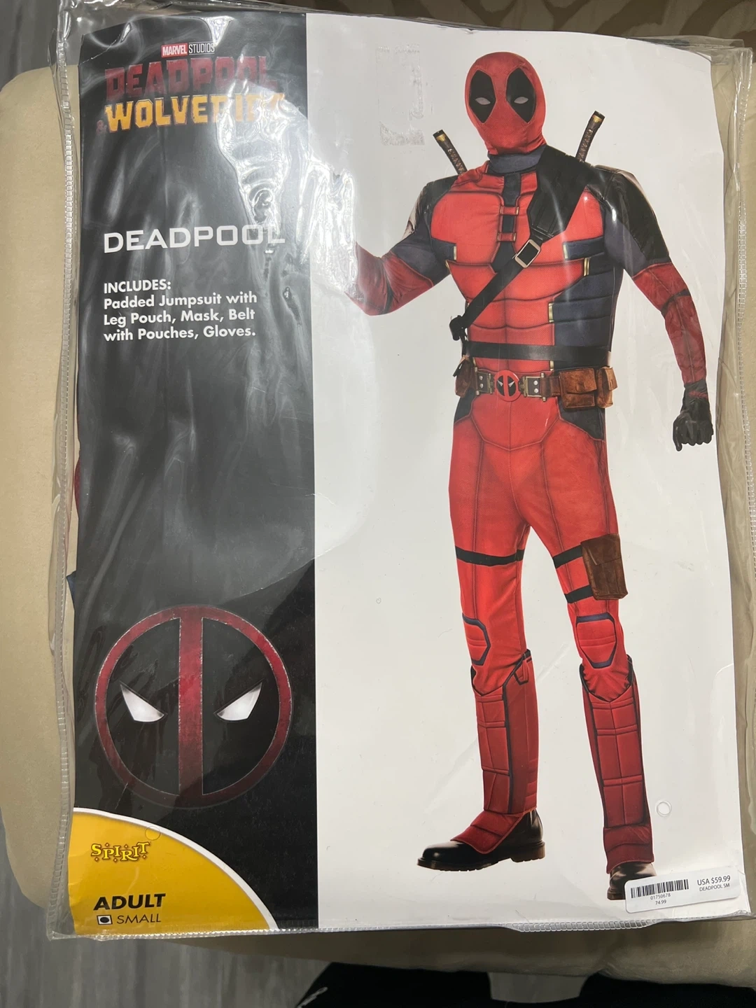 Get ready to save the day (or at least look like you are) with this Deadpool costume! It's an adult size small and includes the padded jumpsuit with leg pouch, mask, belt with pouches, and gloves. Originally bought for $59.90, it's ready for a new adventure!