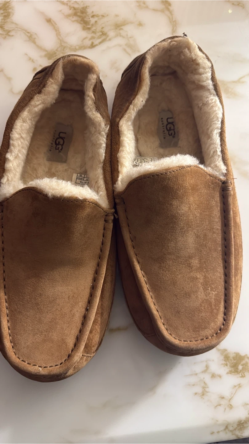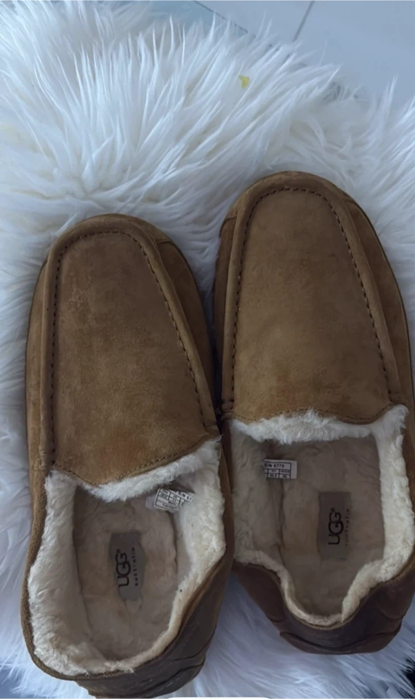 Cozy UGG Men's Ascot slippers in size 9! These are a classic style and great for keeping your feet warm around the house. They're made with soft suede and lined with plush sheepskin. Perfect for indoor comfort!
