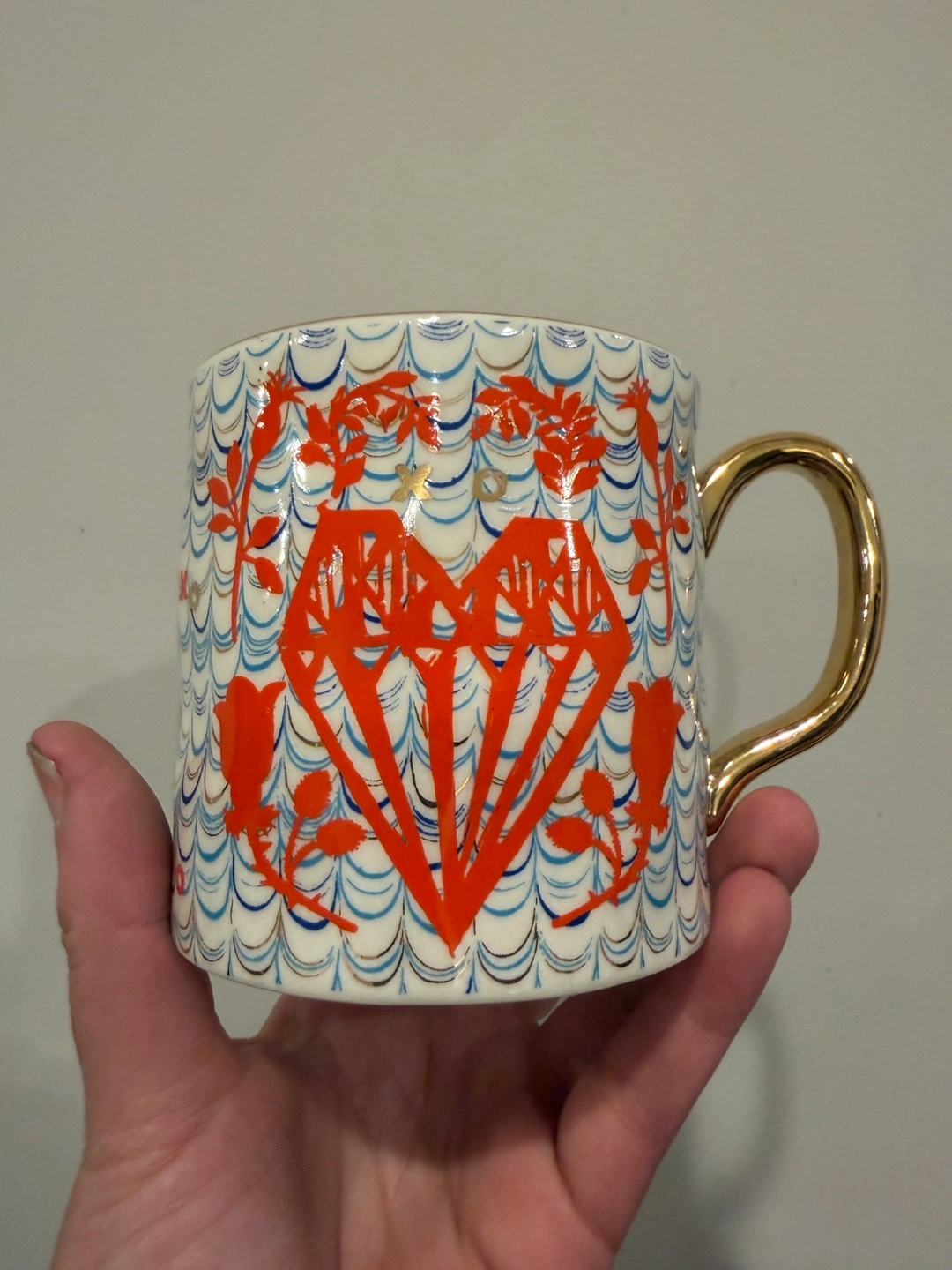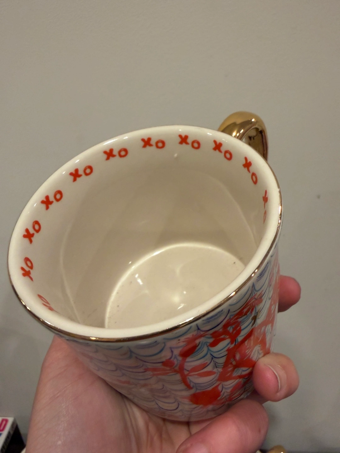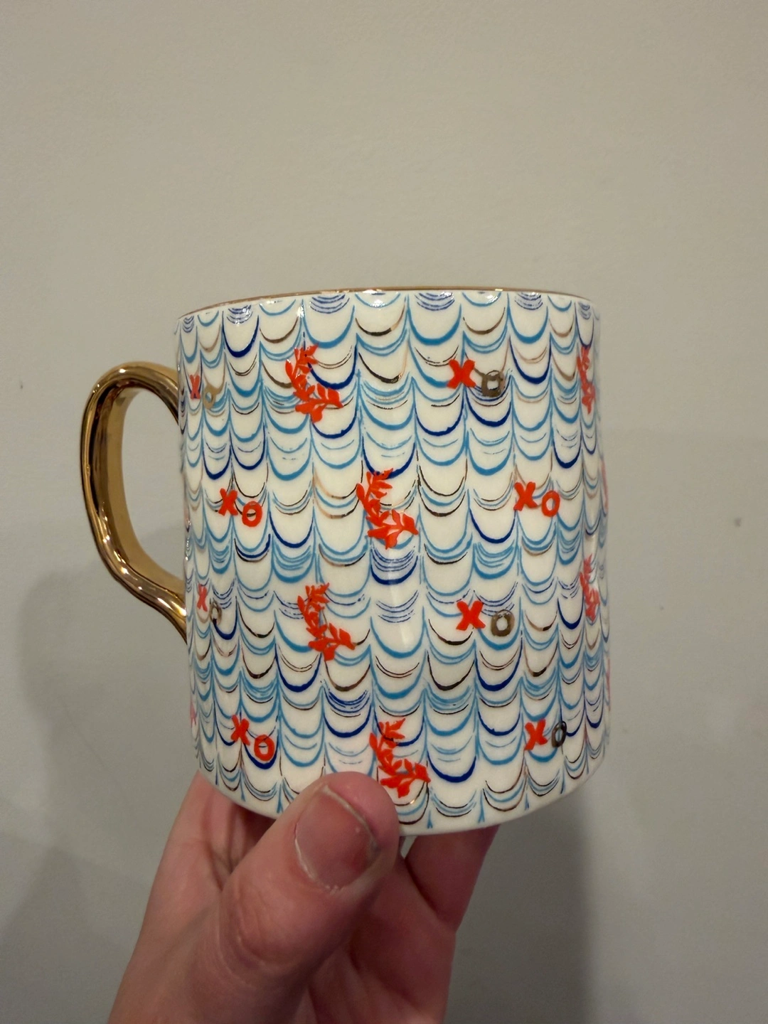 This mug features a white base with a repeating pattern of blue waves, red xos, and red floral designs. It has a shiny gold handle. The interior rim also has red xos printed on it. Ceramic material.