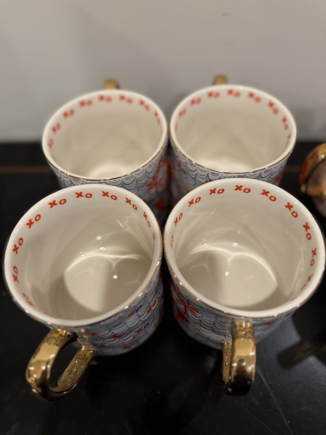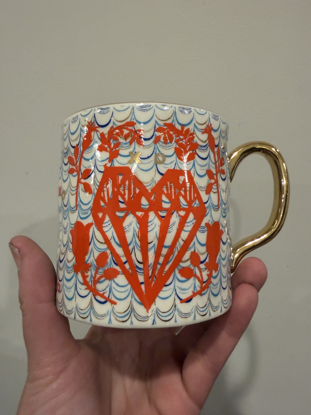 This mug features a white base with a repeating pattern of blue waves, red xos, and red floral designs. It has a shiny gold handle. The interior rim also has red xos printed on it. Ceramic material.