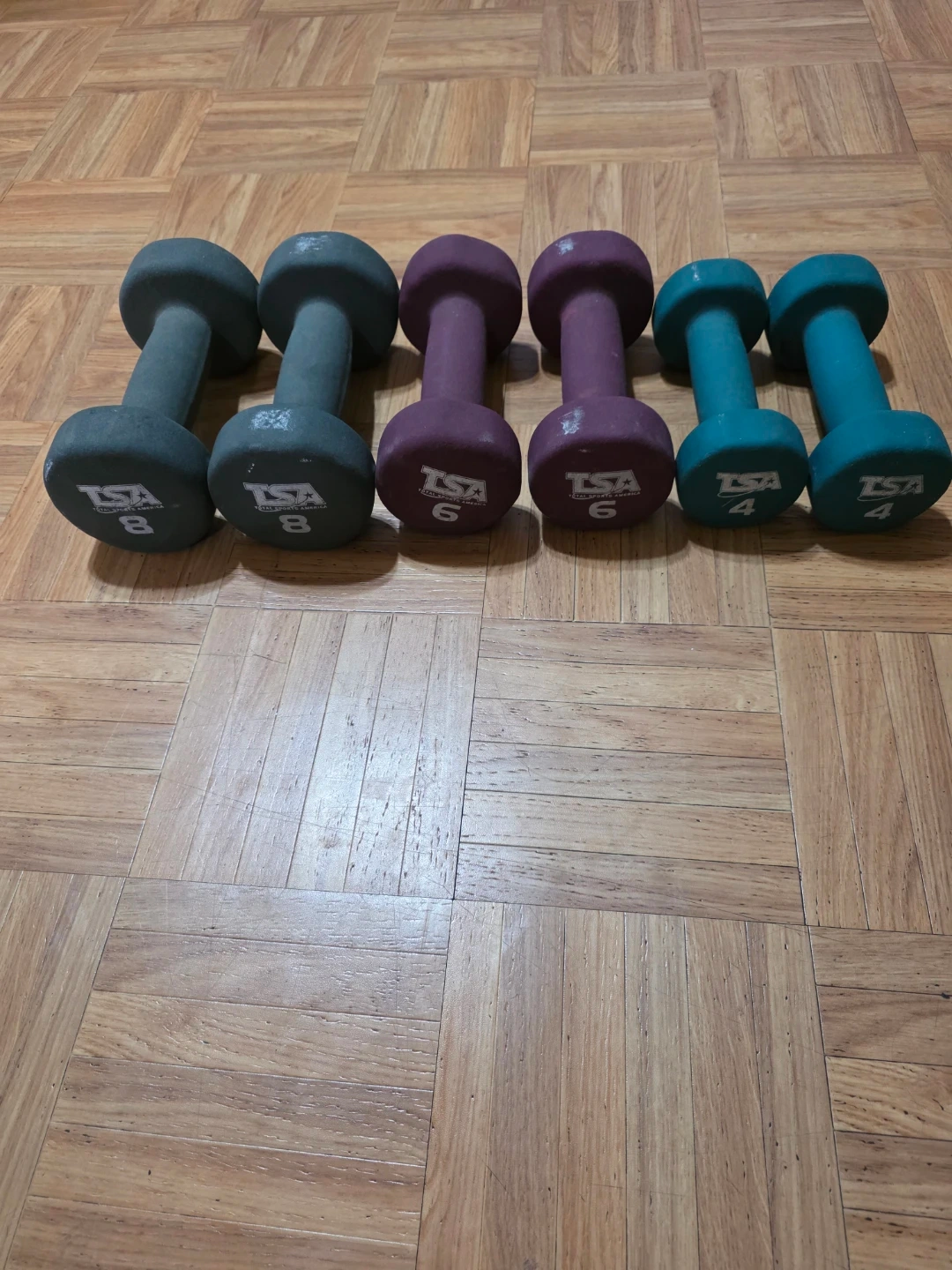 Set of TSA dumbbells. Includes two 8 lb, two 6 lb, and two 4 lb weights. Vinyl coating provides a comfortable grip. Weights are clearly marked for easy identification.