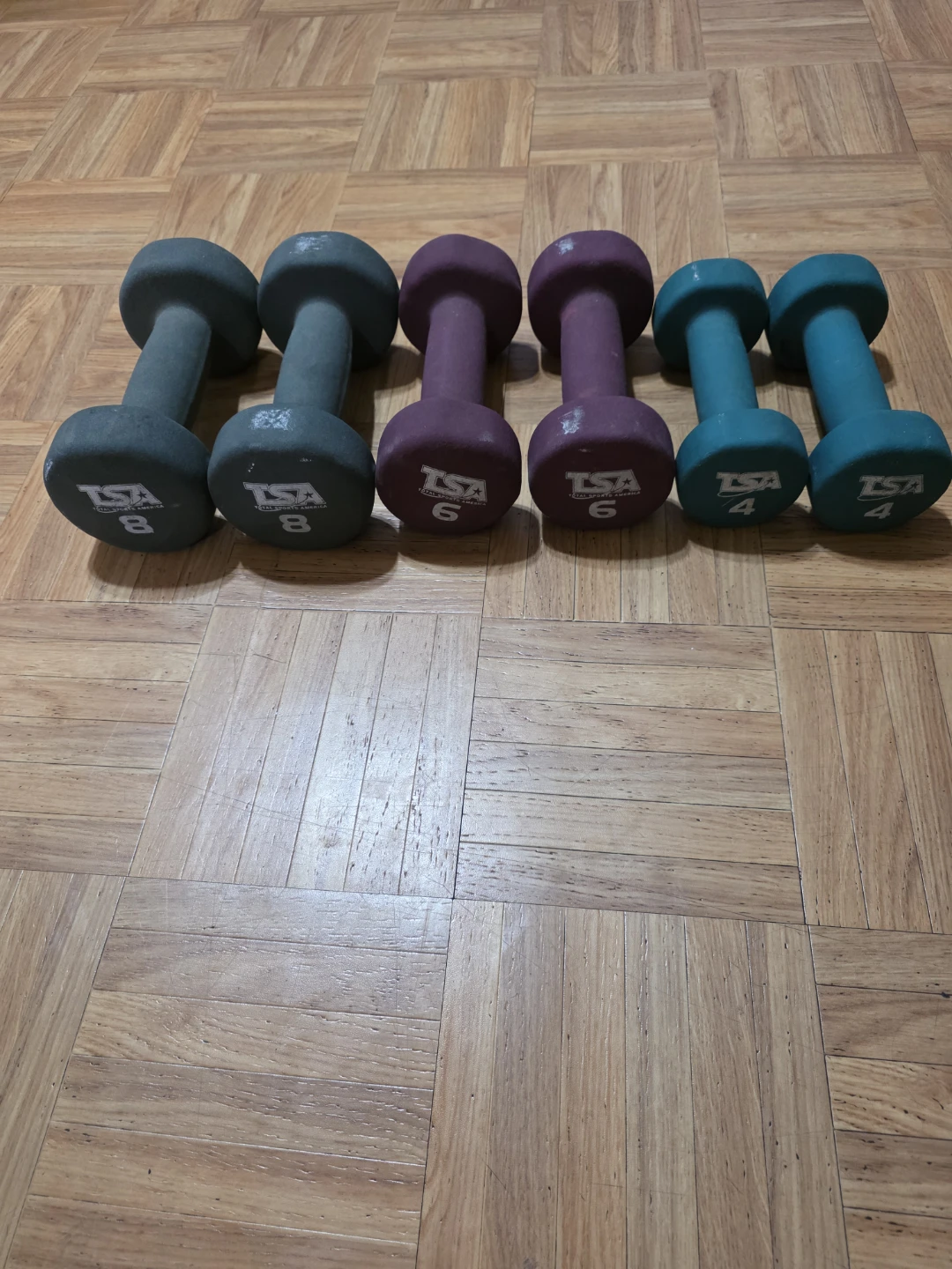 Set of TSA dumbbells. Includes two 8 lb, two 6 lb, and two 4 lb weights. Vinyl coating provides a comfortable grip. Weights are clearly marked for easy identification.