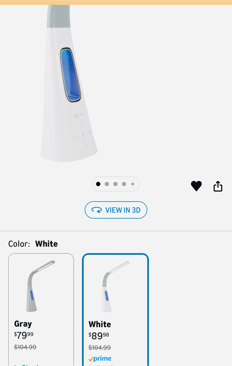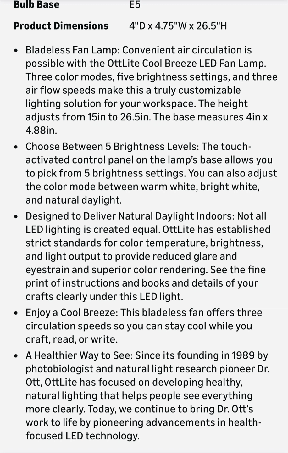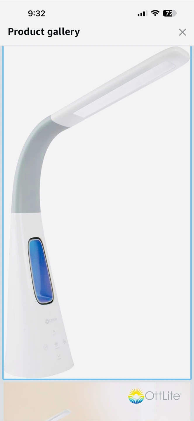 This OttLite LED desk lamp is white. It has a flexible neck and adjustable height from 15" to 26.5". The light source is LED and it features three color modes, five brightness settings, and three color temperatures. It's great for detailed tasks.