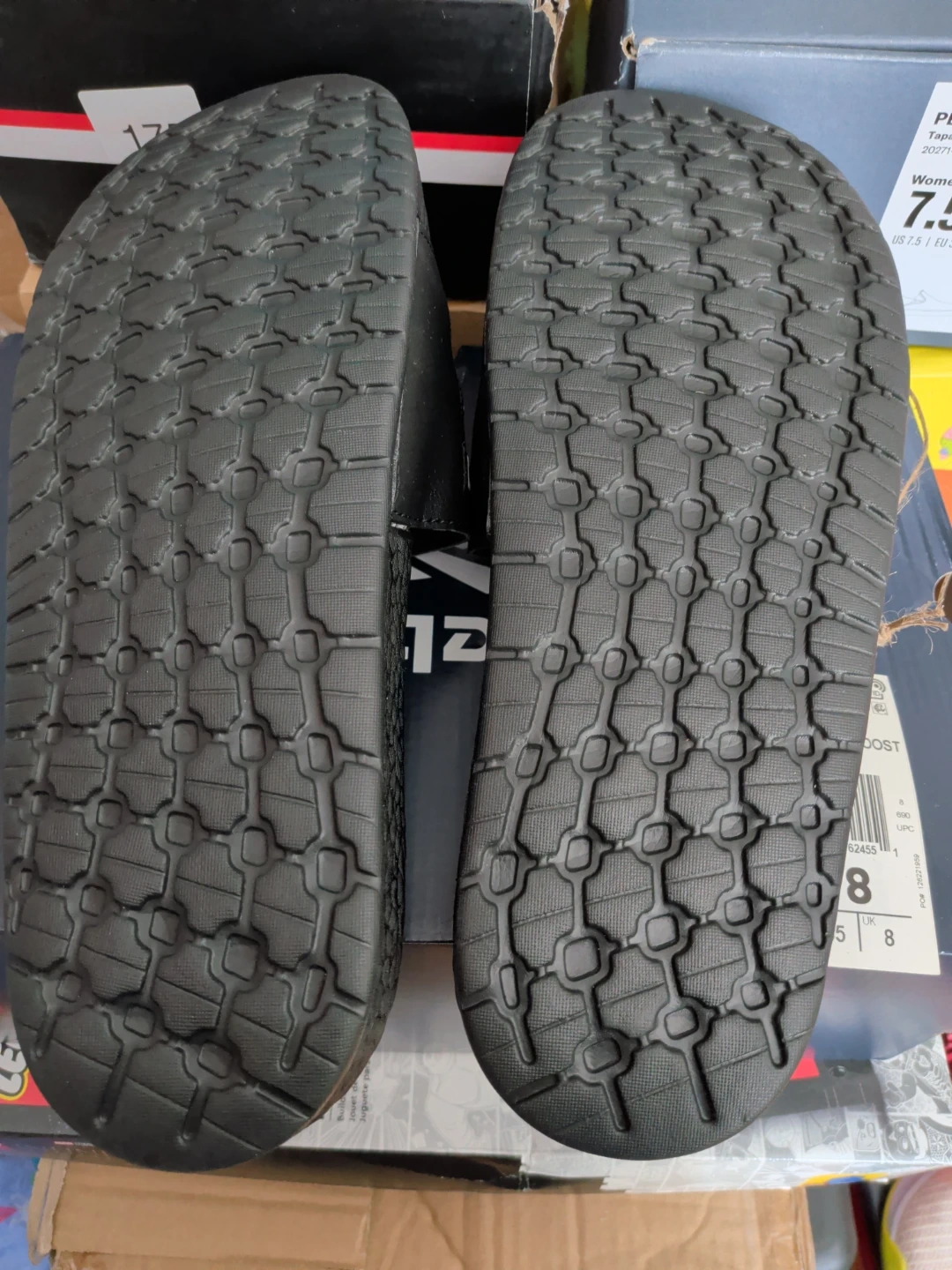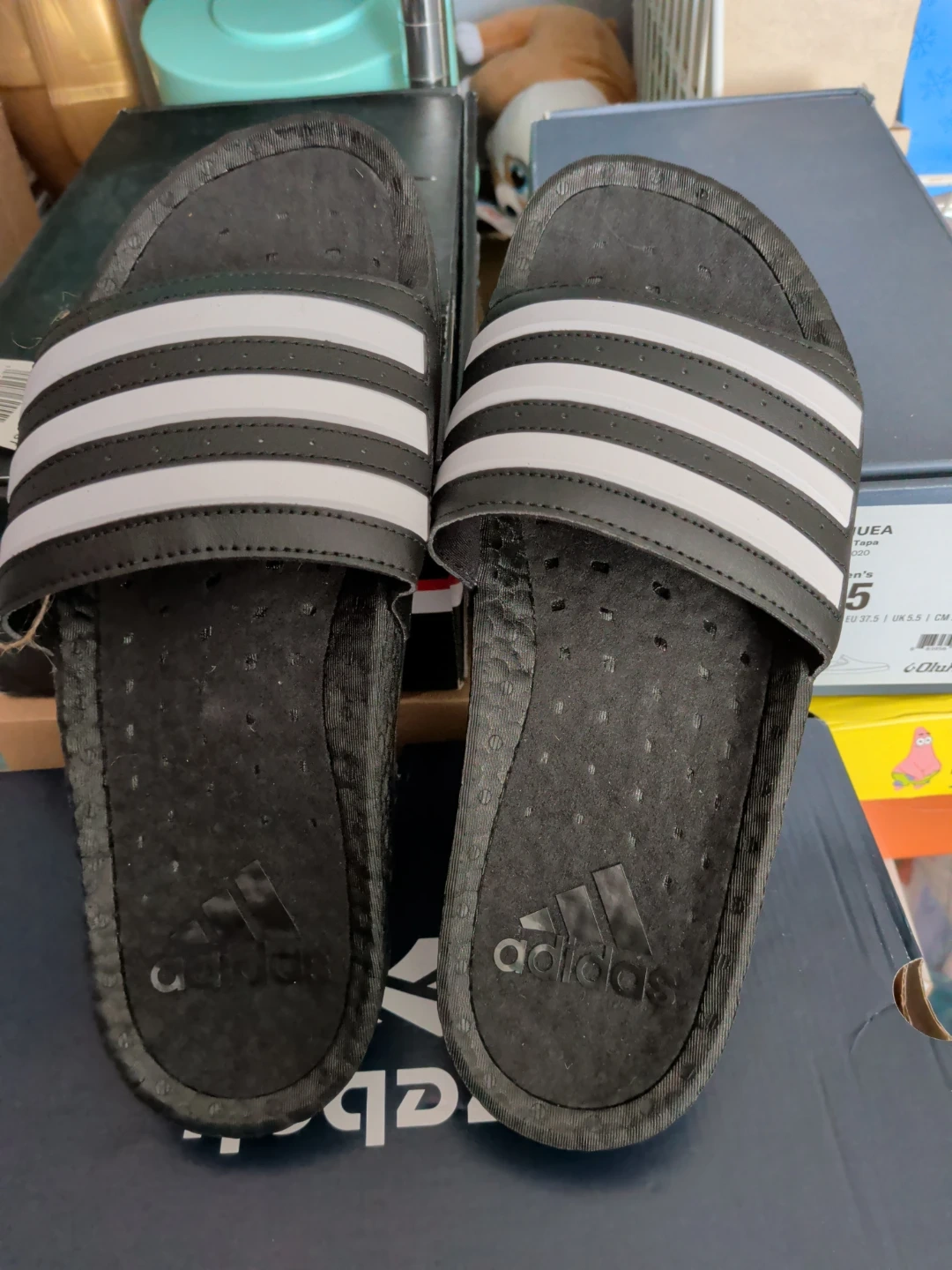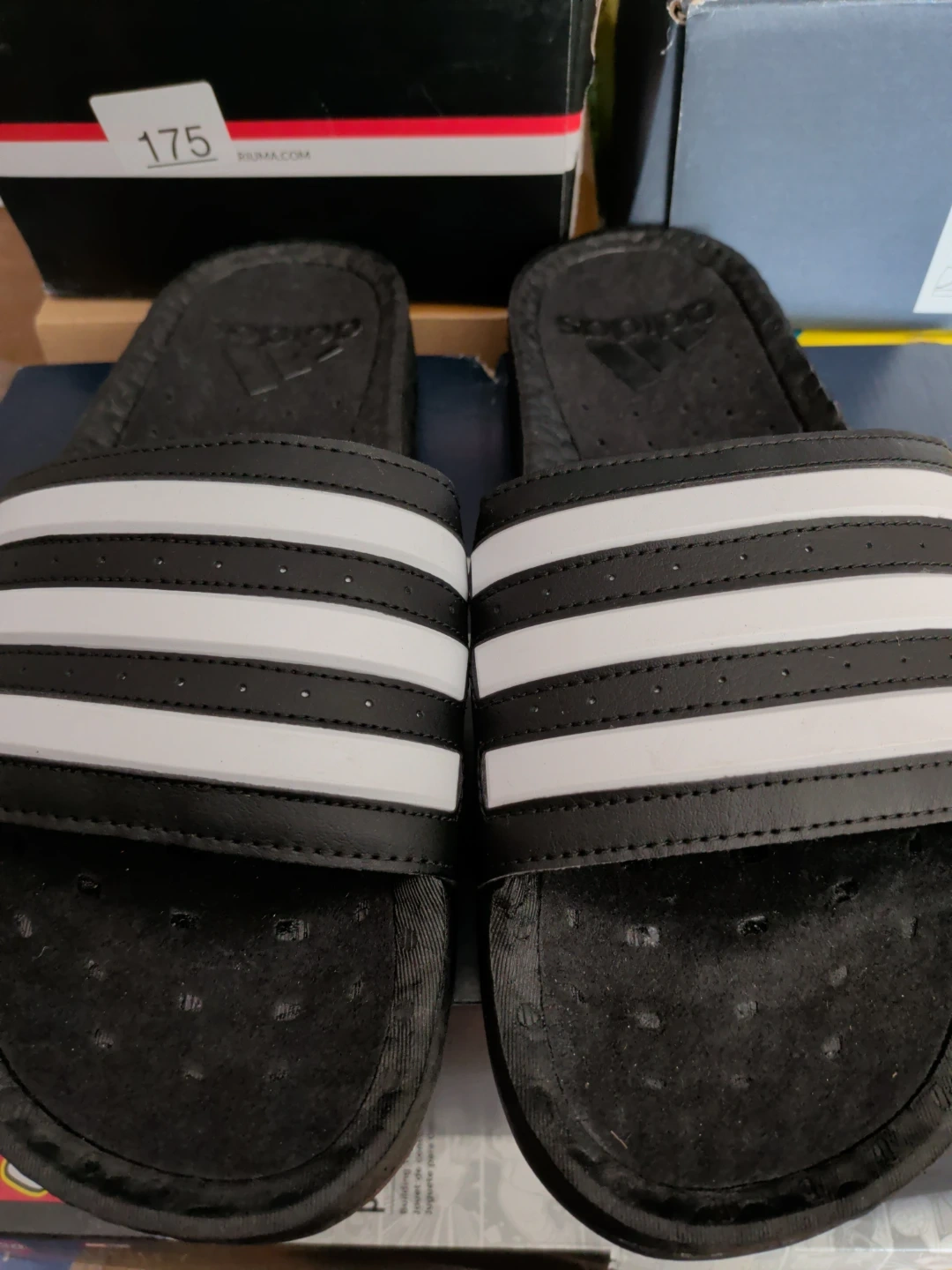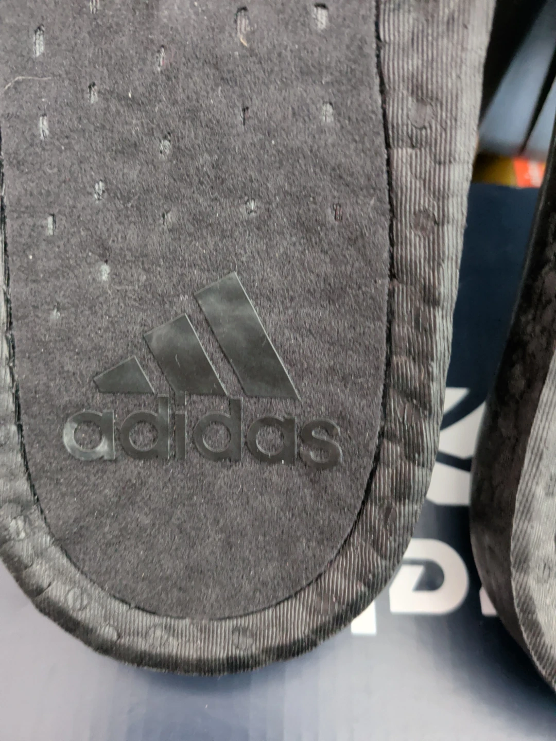 Black Adidas slides with white stripes. Features a contoured footbed and textured outsole for grip. A classic choice for casual wear and post-workout comfort!