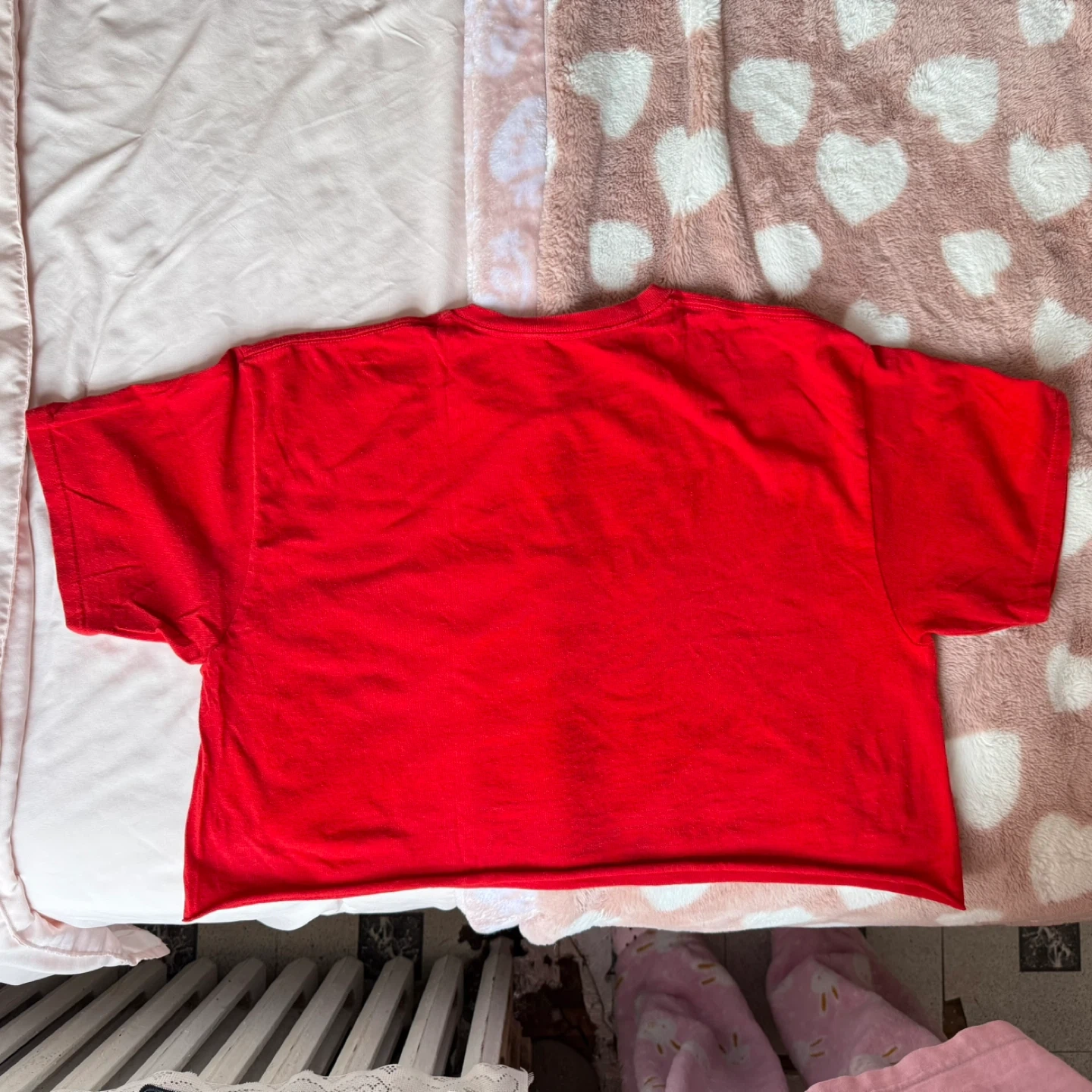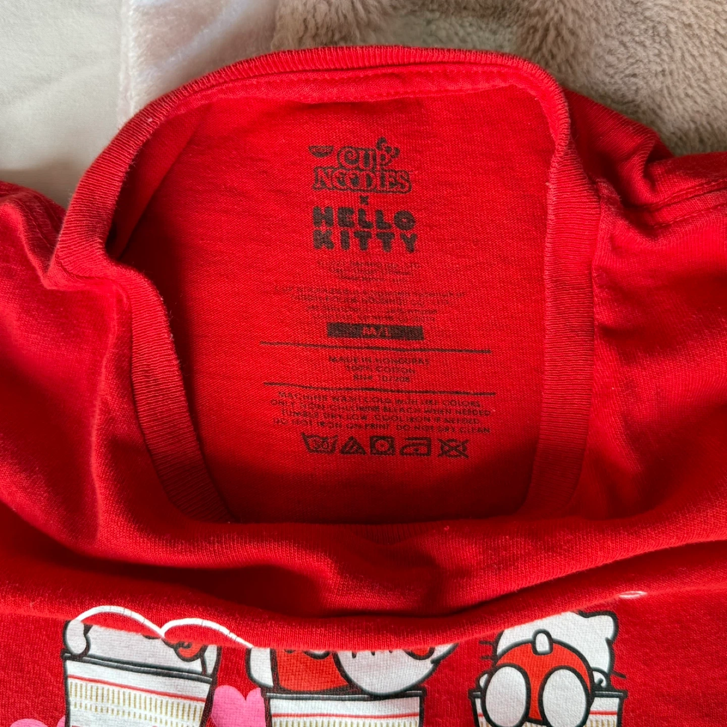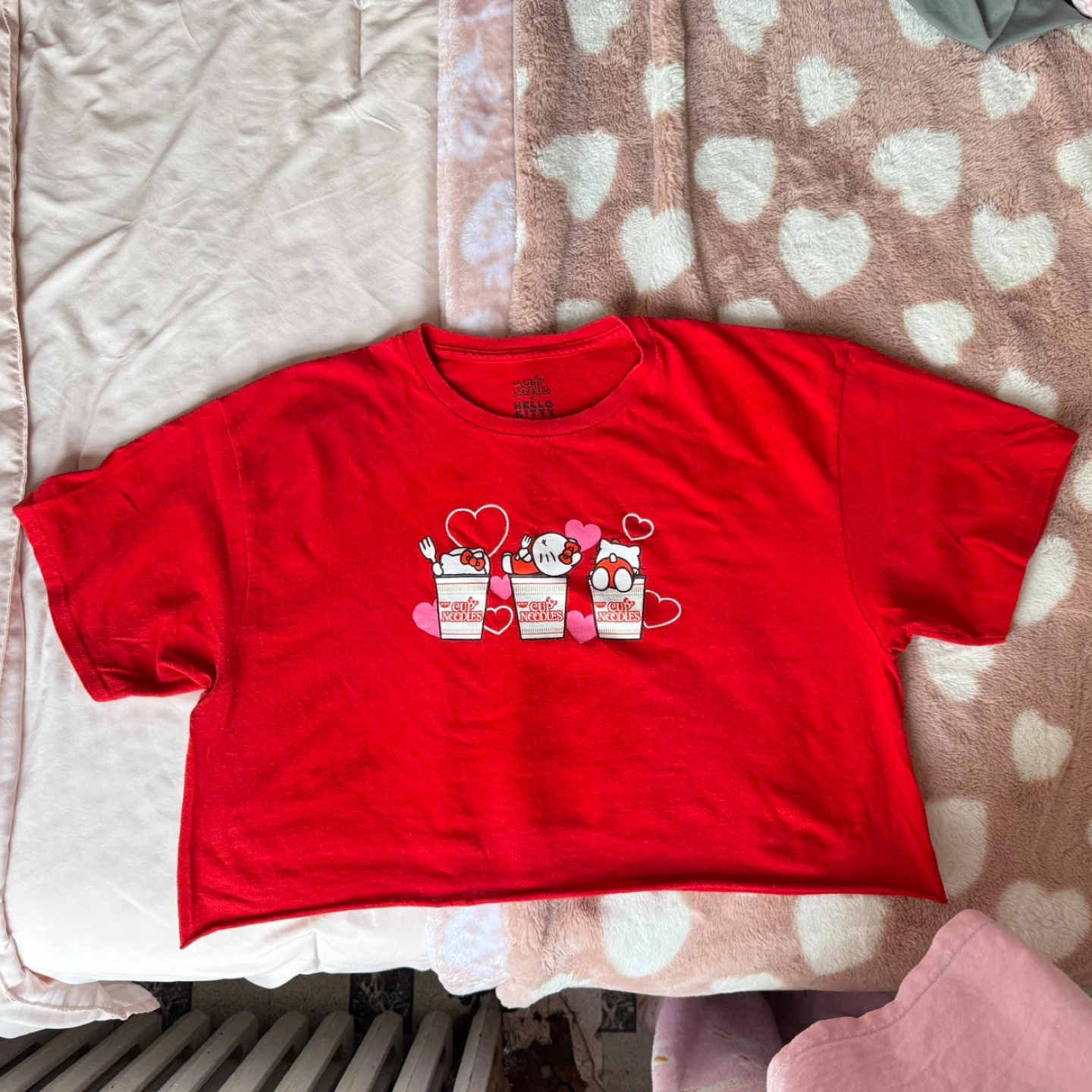Red cropped t-shirt featuring Hello Kitty and Cup Noodles design!! It’s made out of 100% cotton material and is a size medium/large!