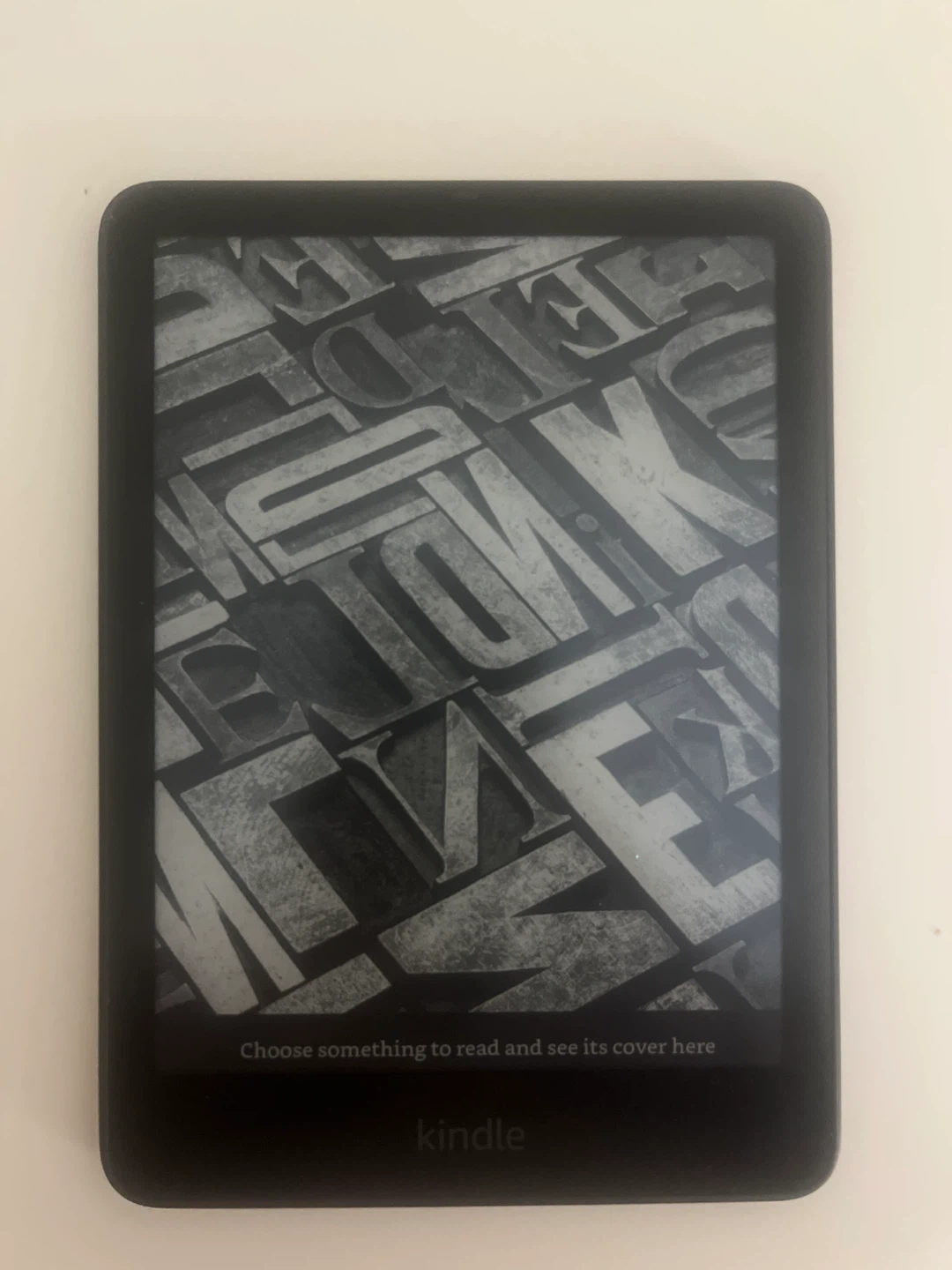 This is an Amazon Kindle e-reader. It's black and has the Amazon logo on the back. Comes with a charging cable.