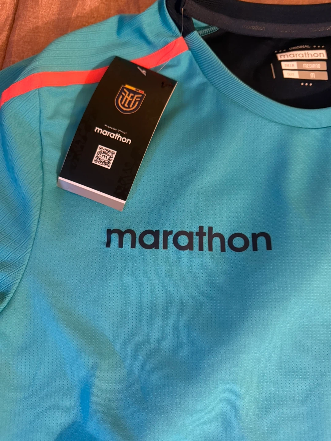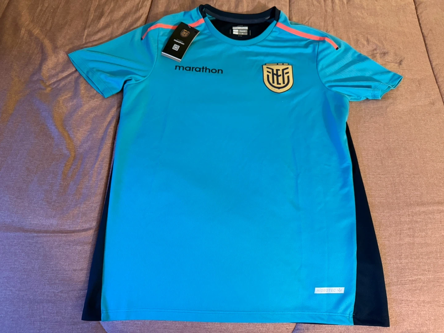 Selling a brand new Marathon Ecuador National Team jersey in size Medium. This jersey is in excellent condition and features the official Ecuador National Team logo. The main color is a vibrant light blue with a black accent and a coral stripe. It's made of a breathable material, perfect for sports or casual wear
