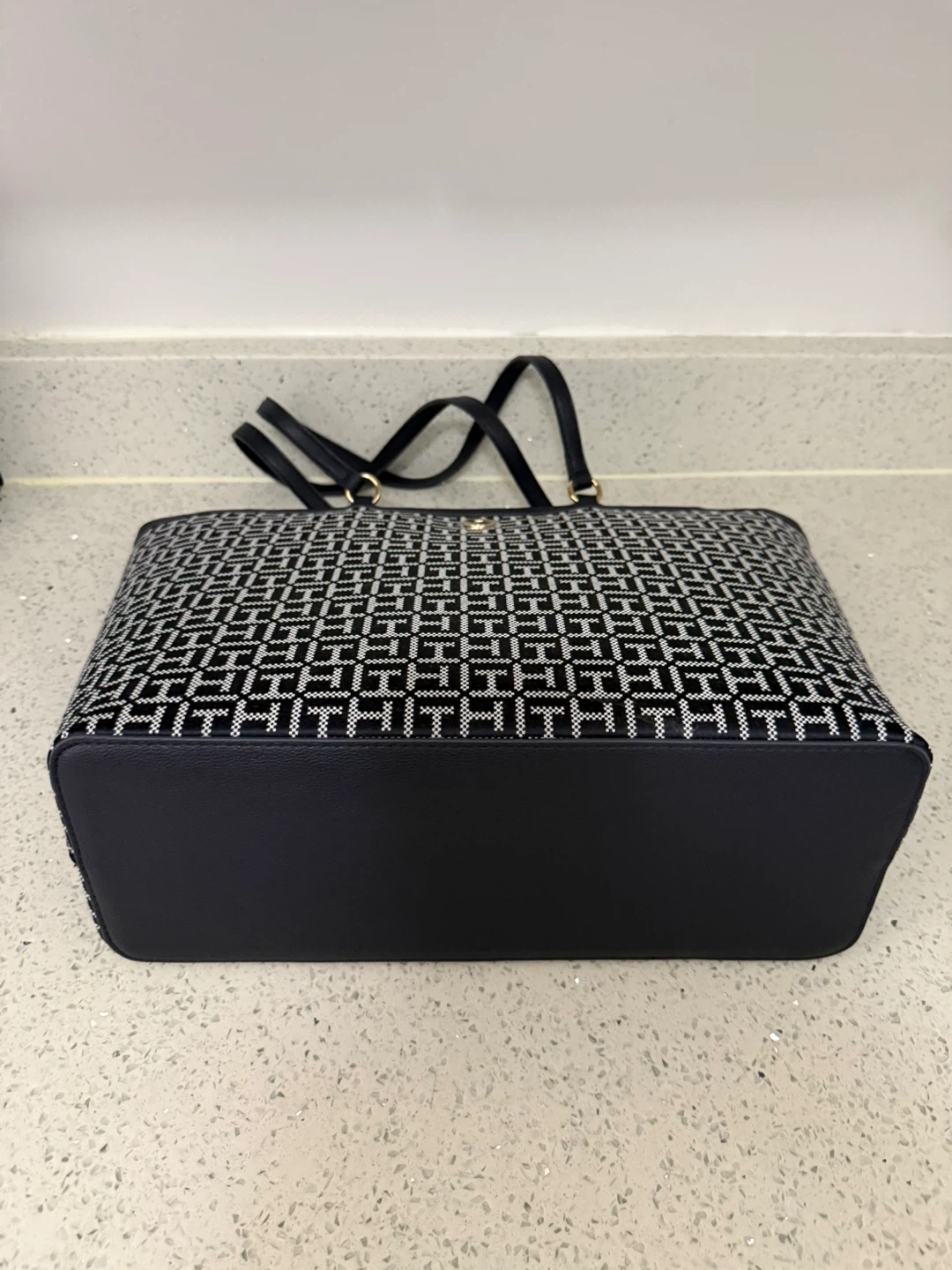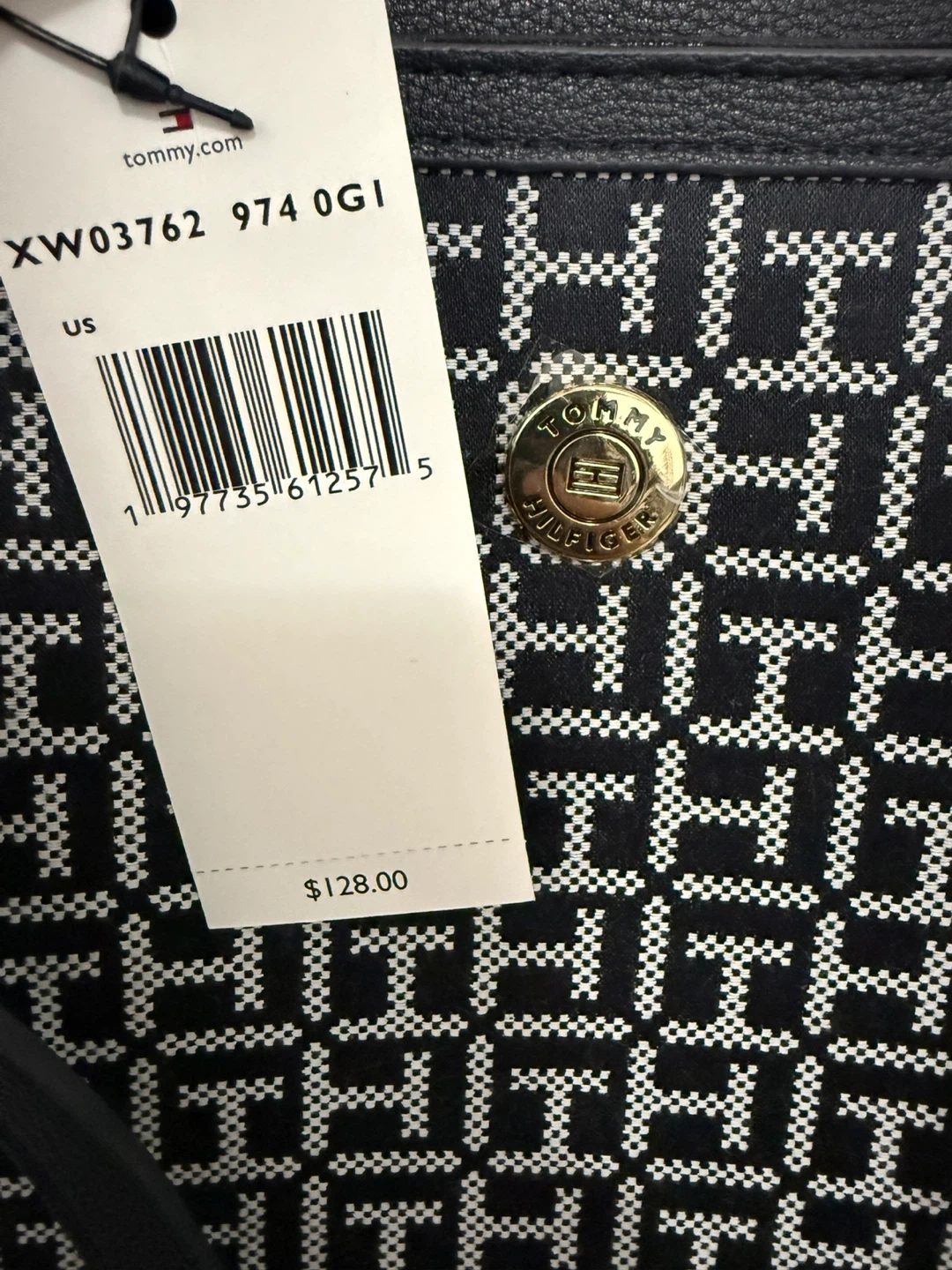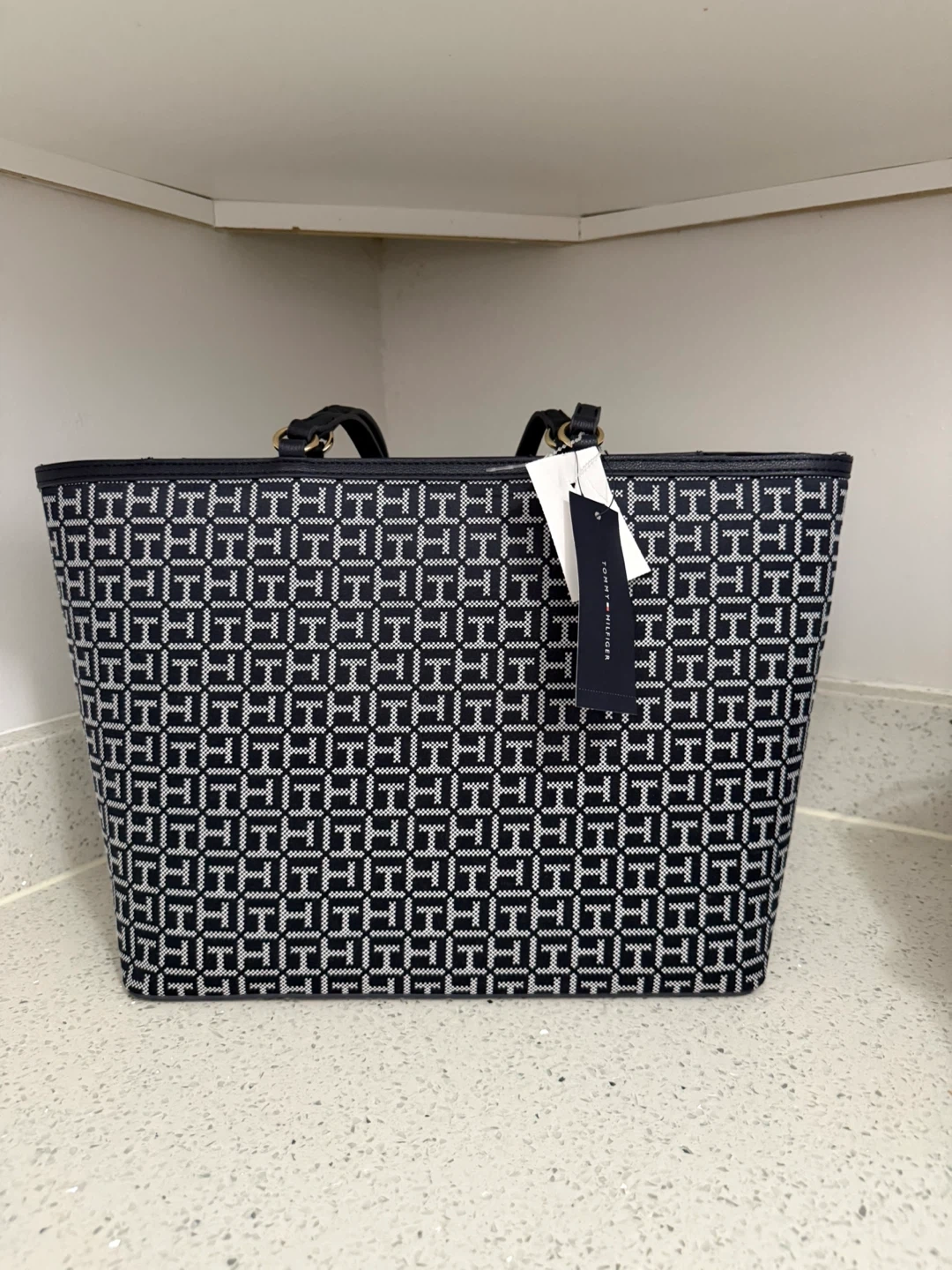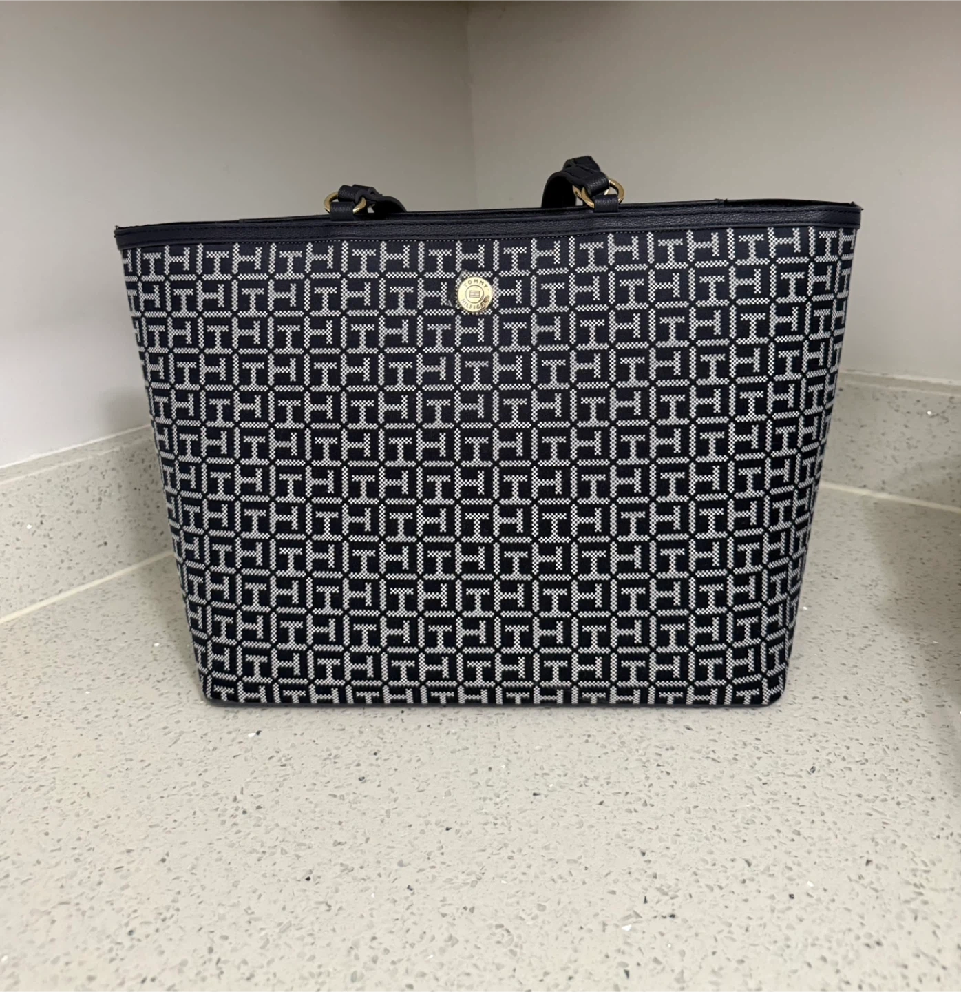 This Tommy Hilfiger tote bag features a classic navy and white all-over monogram pattern. It has dual top handles and a secure zipper closure. A versatile bag for everyday use!