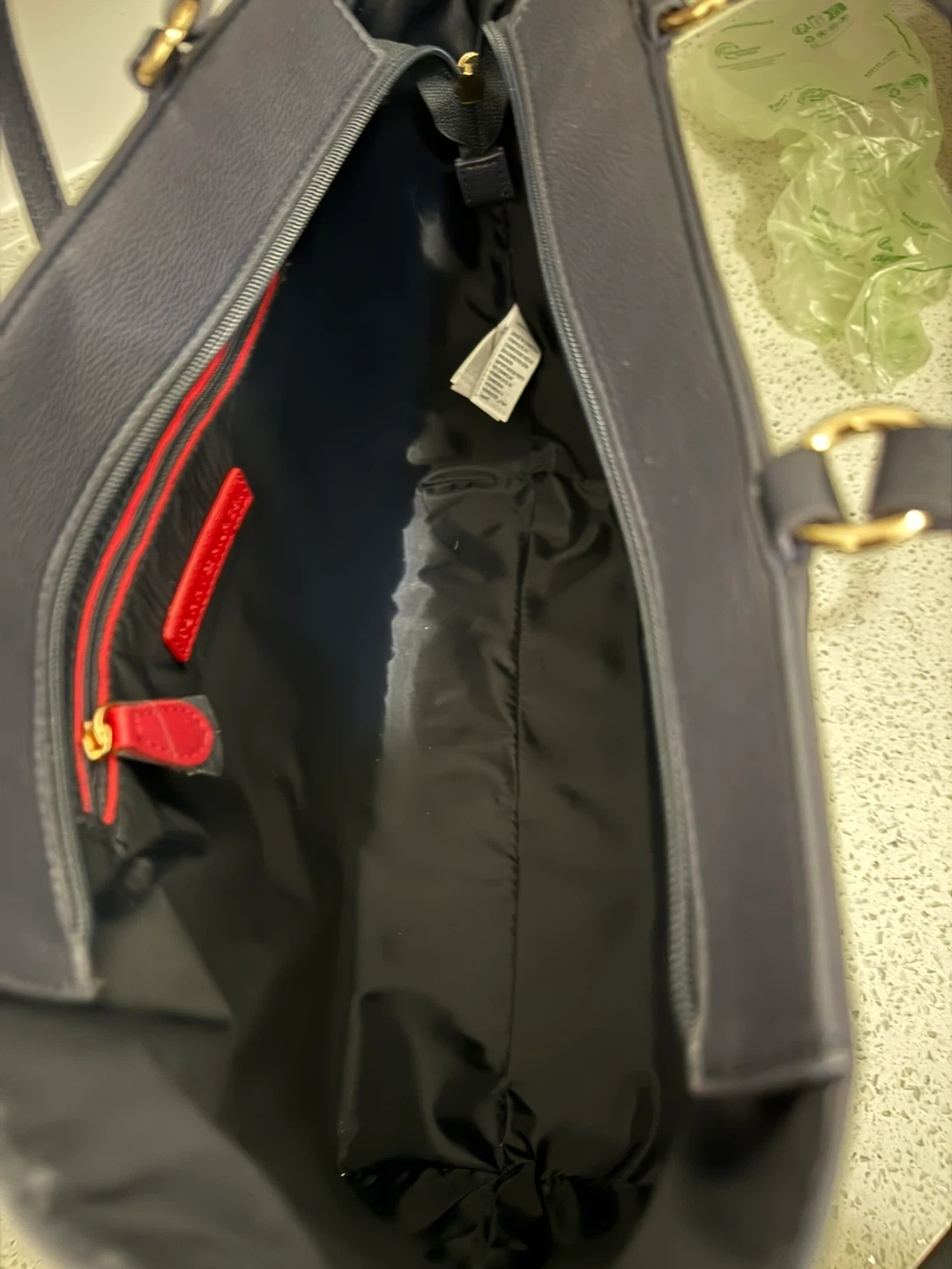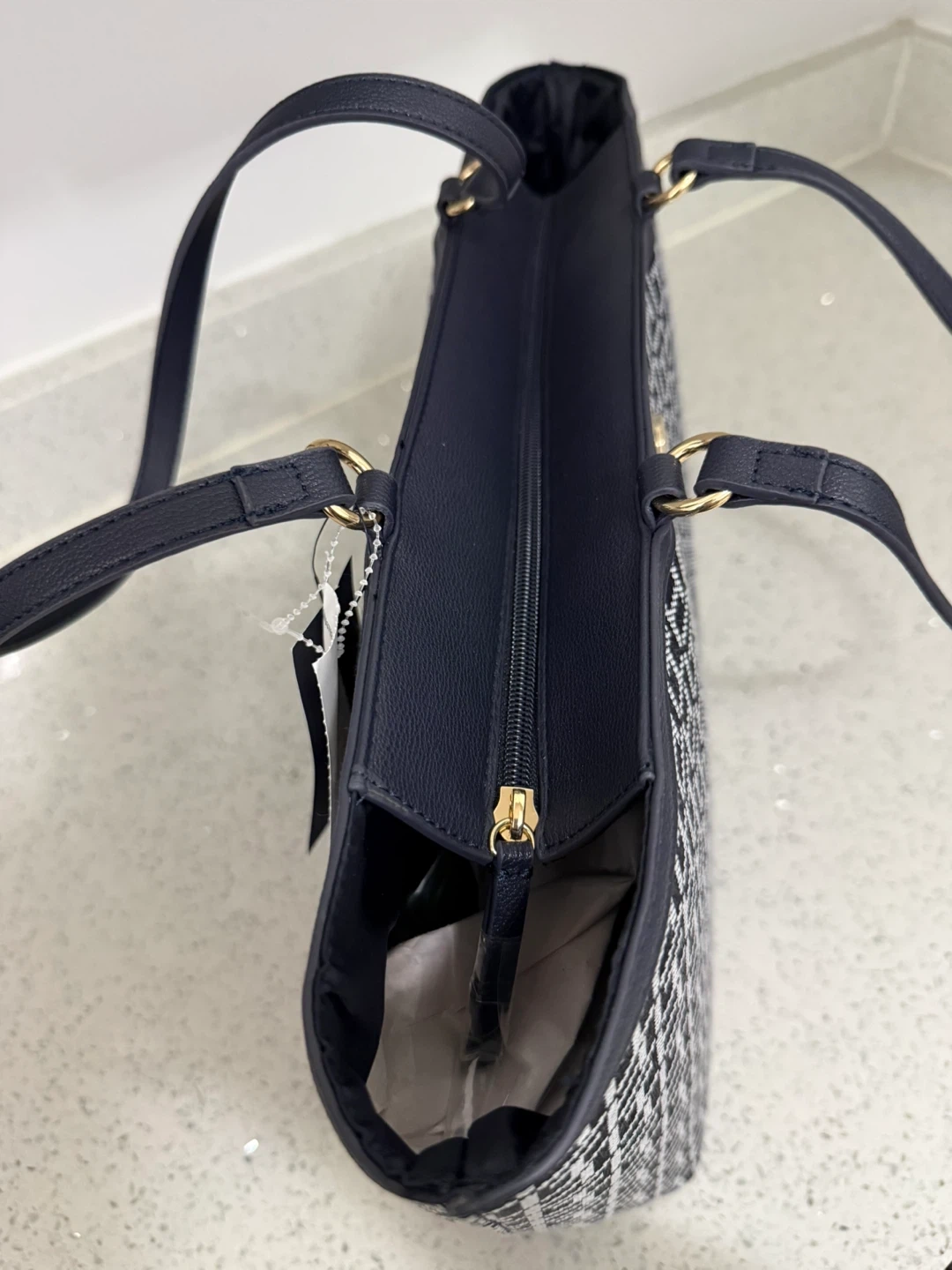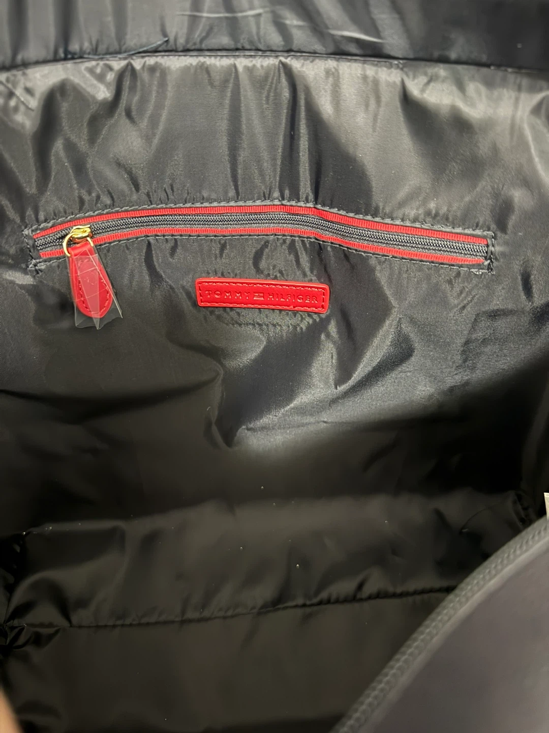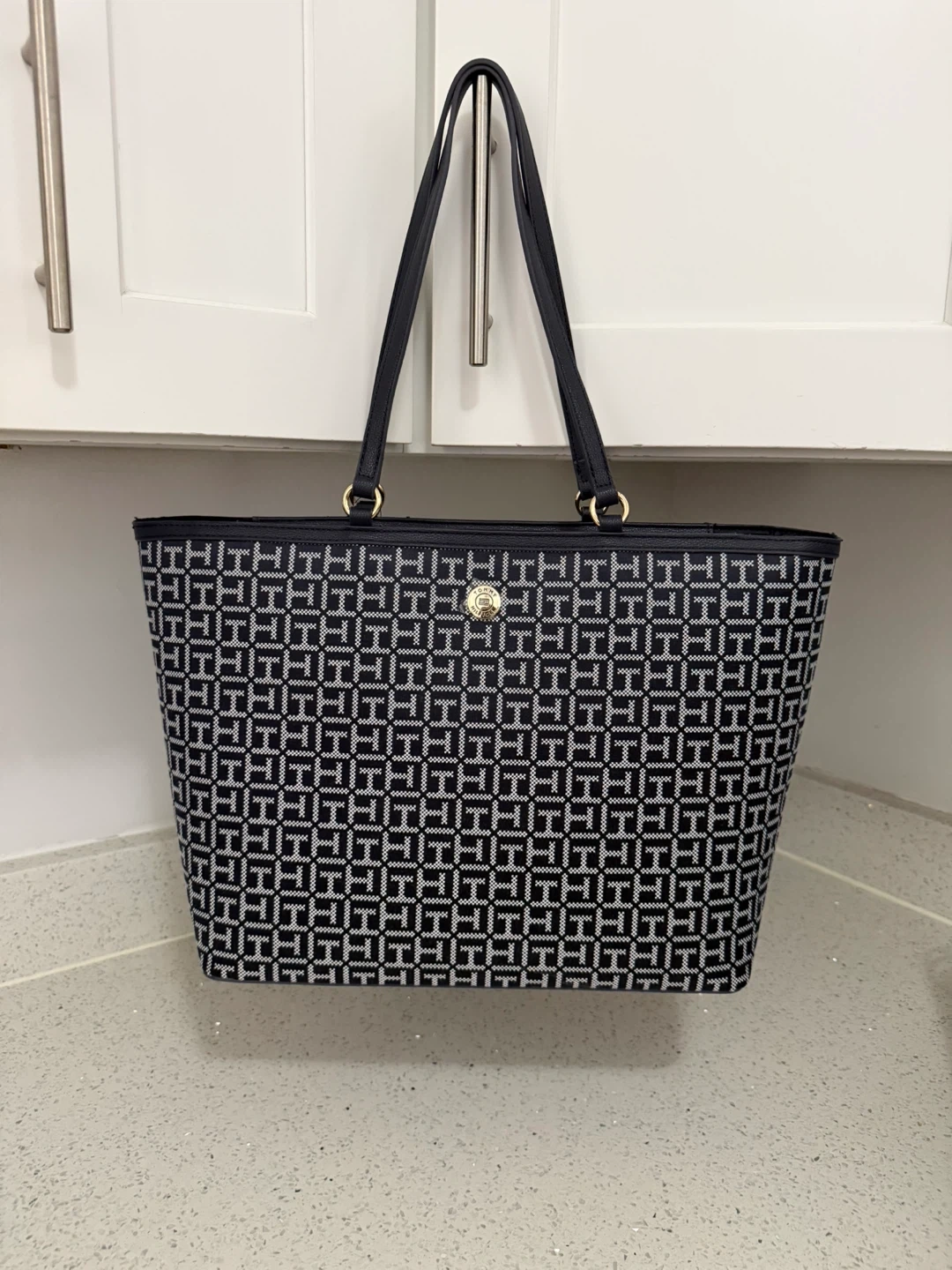 This Tommy Hilfiger tote bag features a classic navy and white all-over monogram pattern. It has dual top handles and a secure zipper closure. A versatile bag for everyday use!