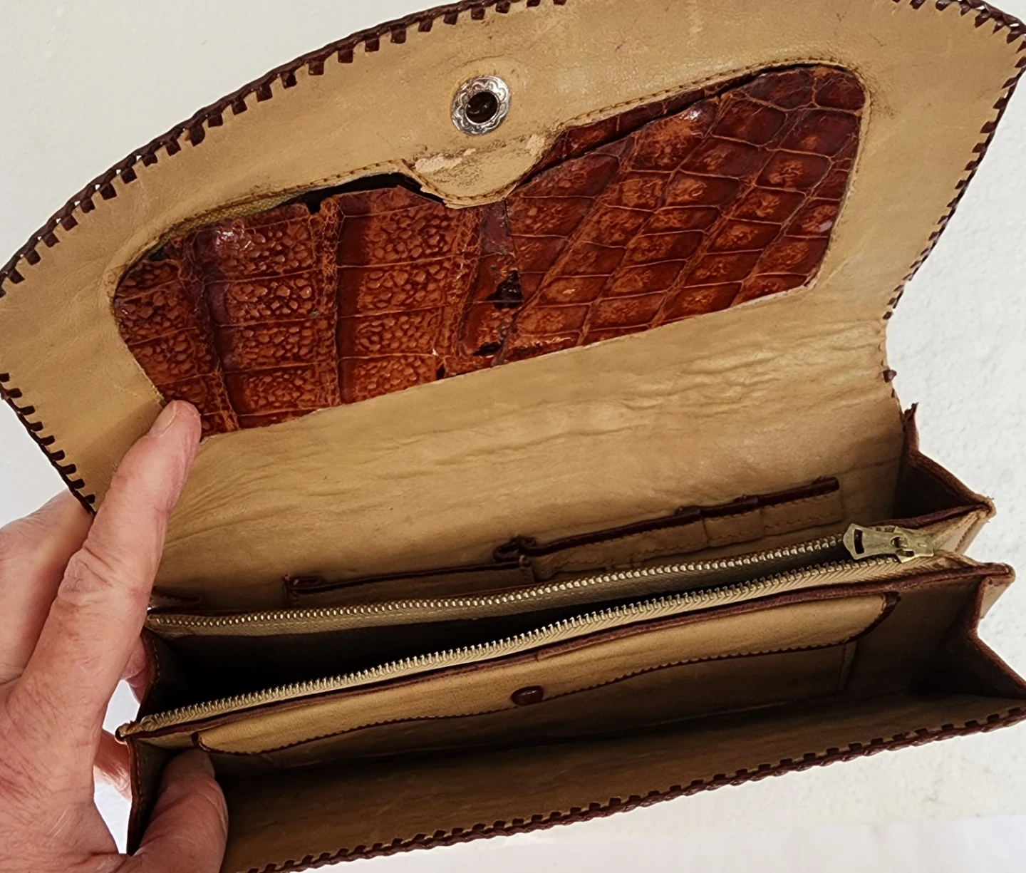 Vintage genuine alligator wallets. They come in various shades of brown and have a unique, textured look.