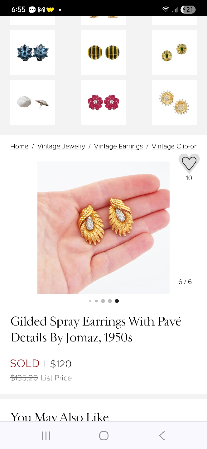 Selling a pair of vintage Jomaz gilded spray earrings with pavé details from the 1950s. They are clip-on style and have a beautiful, classic design. Originally listed for $135.20!