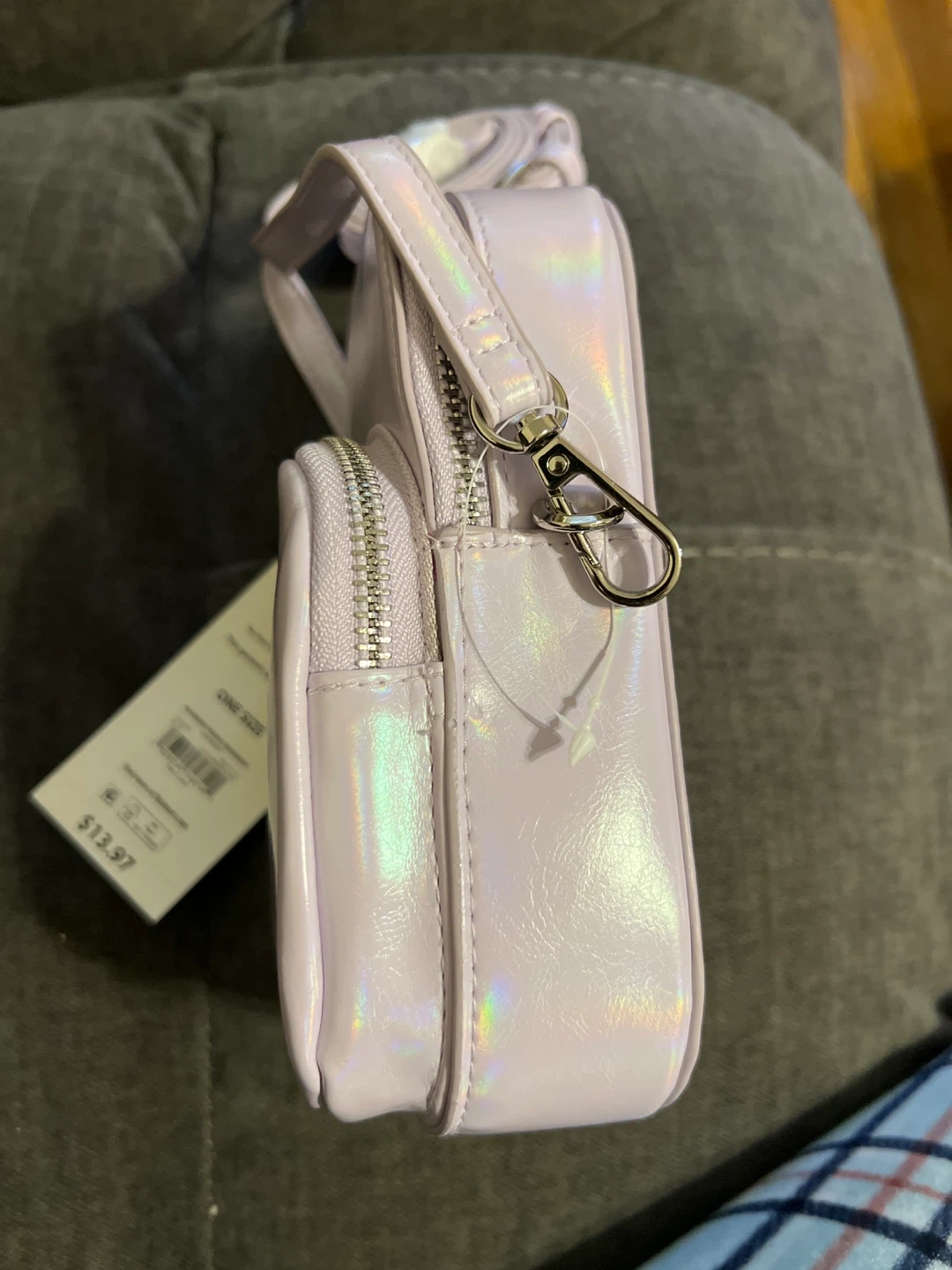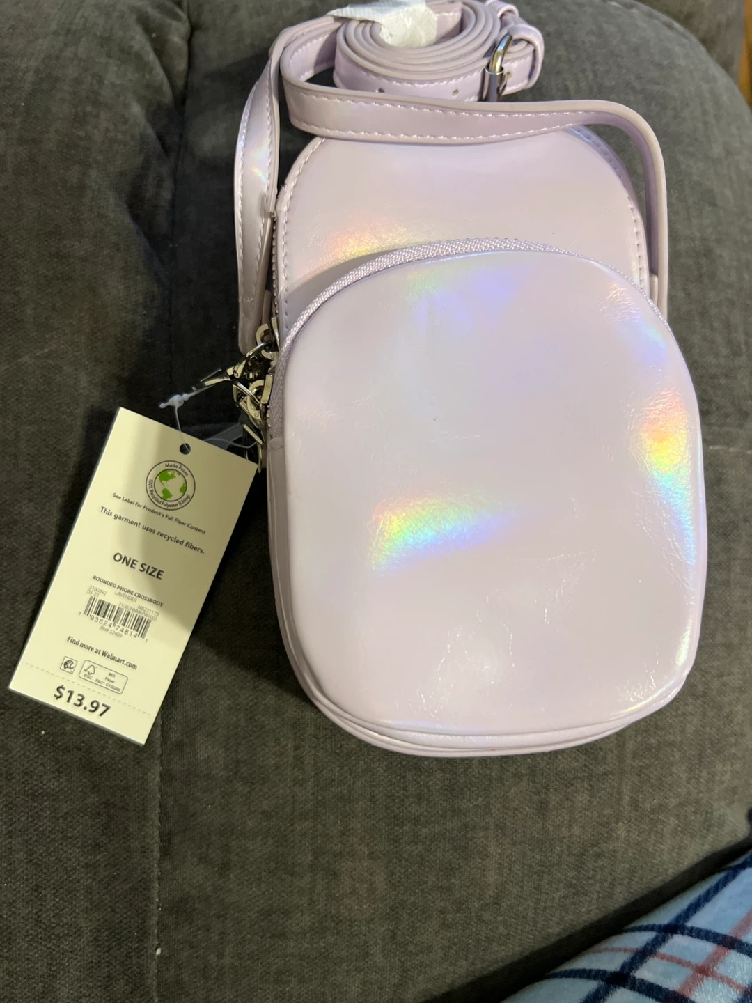 This holographic phone crossbody bag is a convenient way to carry your essentials. It's one size and features a shimmering iridescent finish. This bag is great for quick trips or everyday use! Great for kids with cell phones