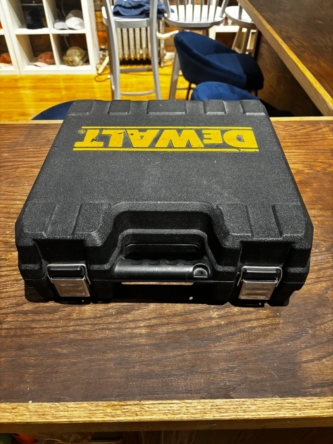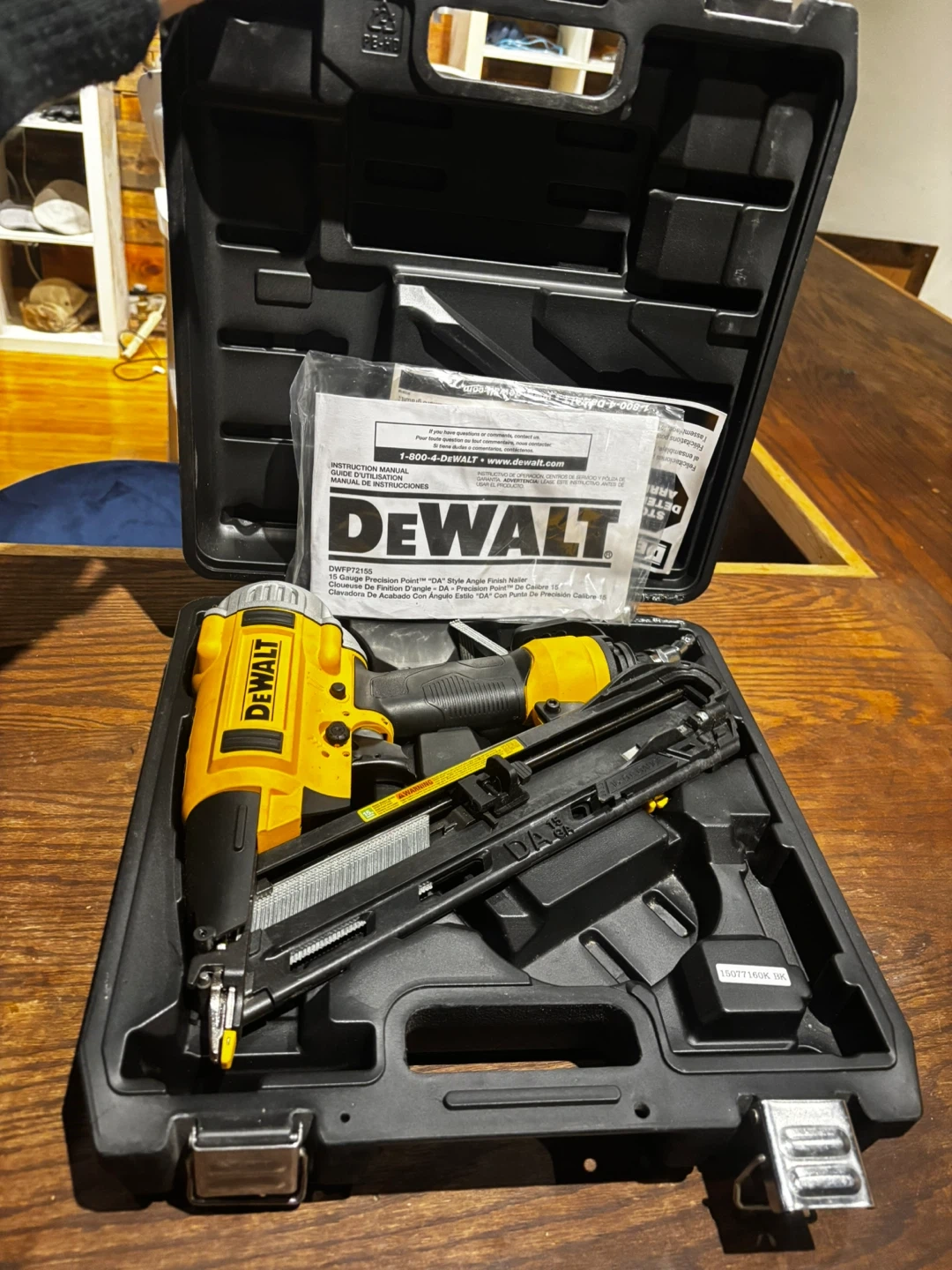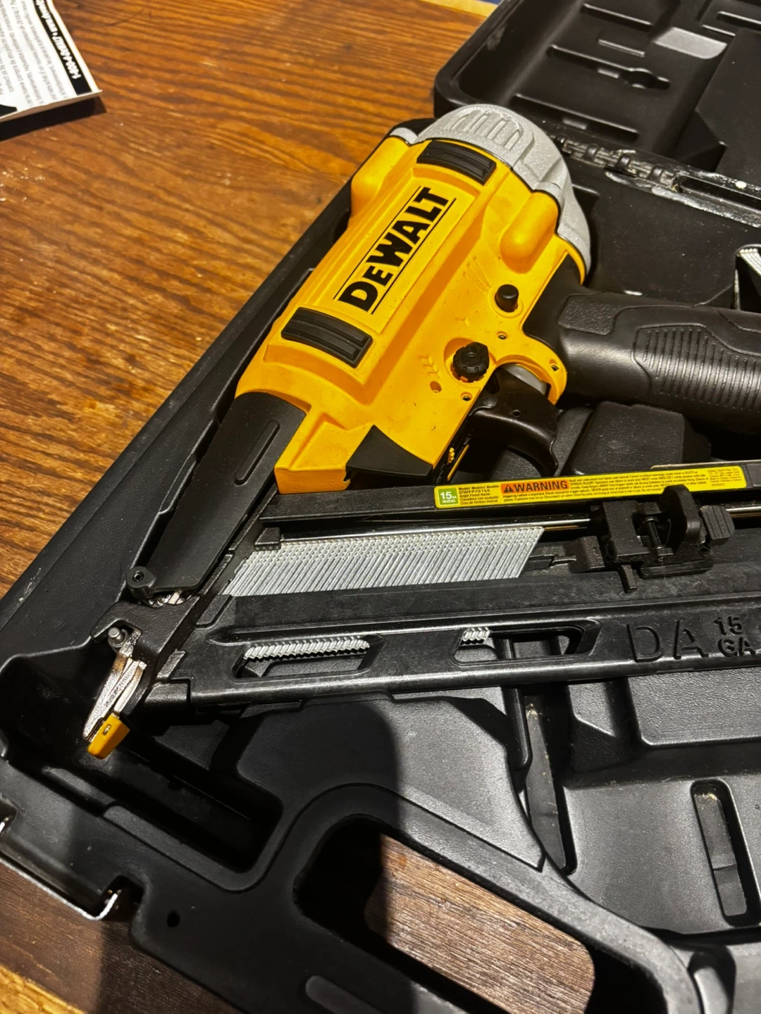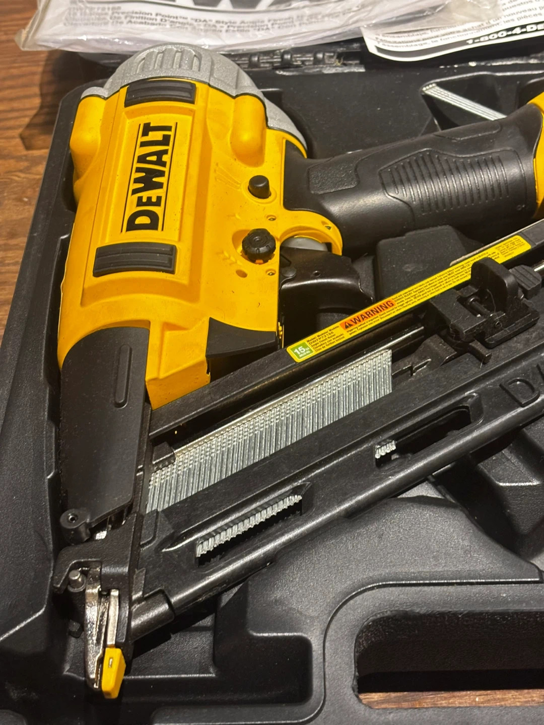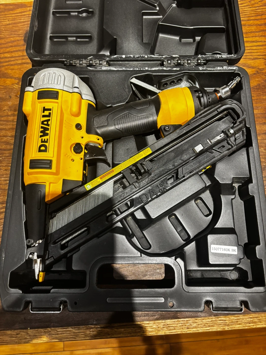 This DeWalt brad nailer comes in its original case. It's a 15-gauge nailer designed for various woodworking tasks. The tool and case are included.