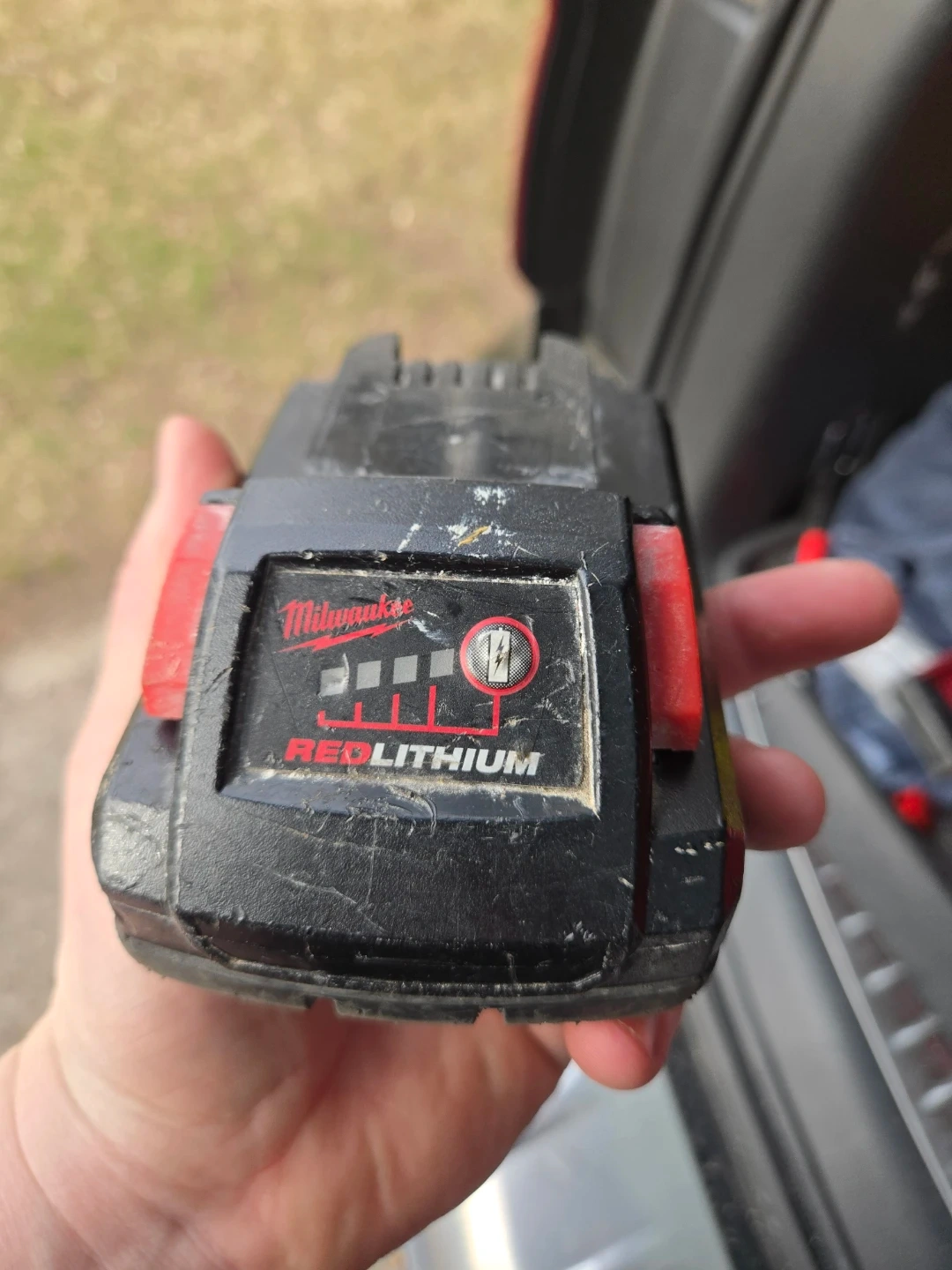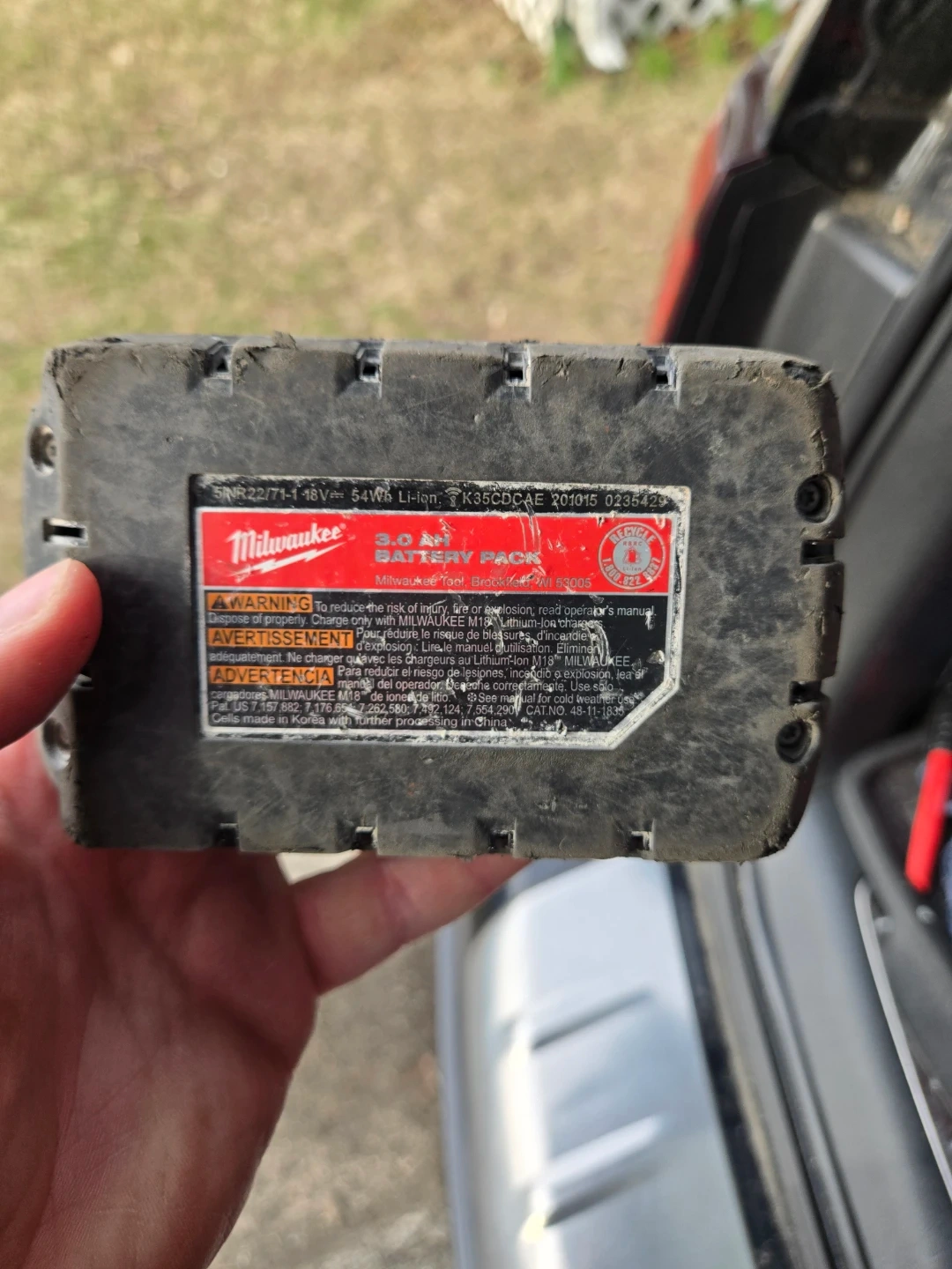 This is a Milwaukee 18V 3.0 Ah REDLITHIUM battery pack. It's compatible with M18 tools. Shows signs of use but is functional.