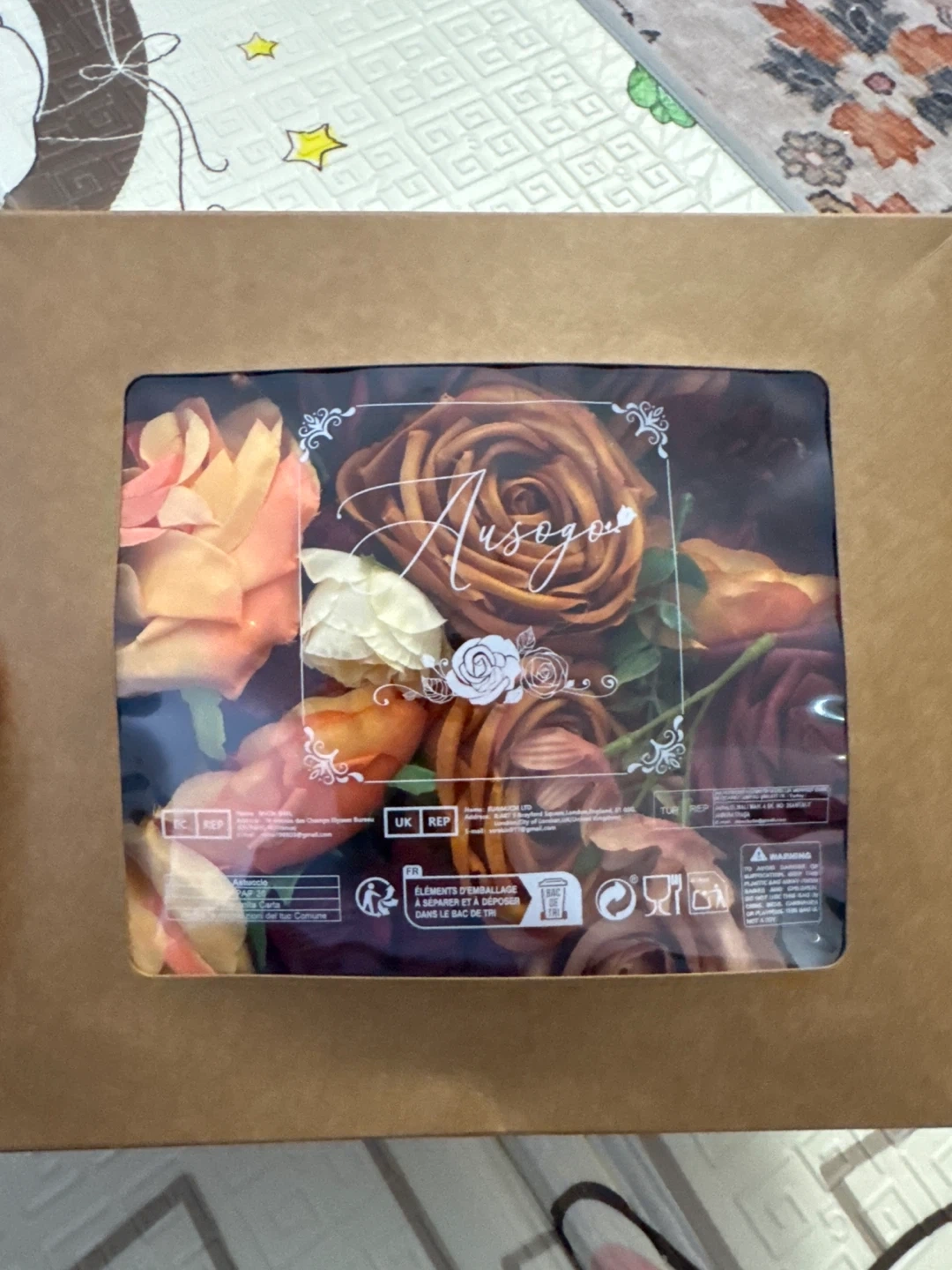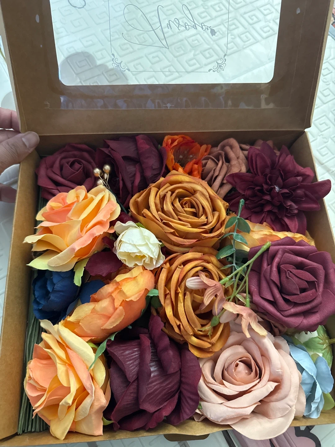 A set of artificial flowers in assorted colors like burgundy, peach, and burnt orange. Includes roses and dahlia-style blooms. Made from fabric material. Perfect for craft projects or home decor!