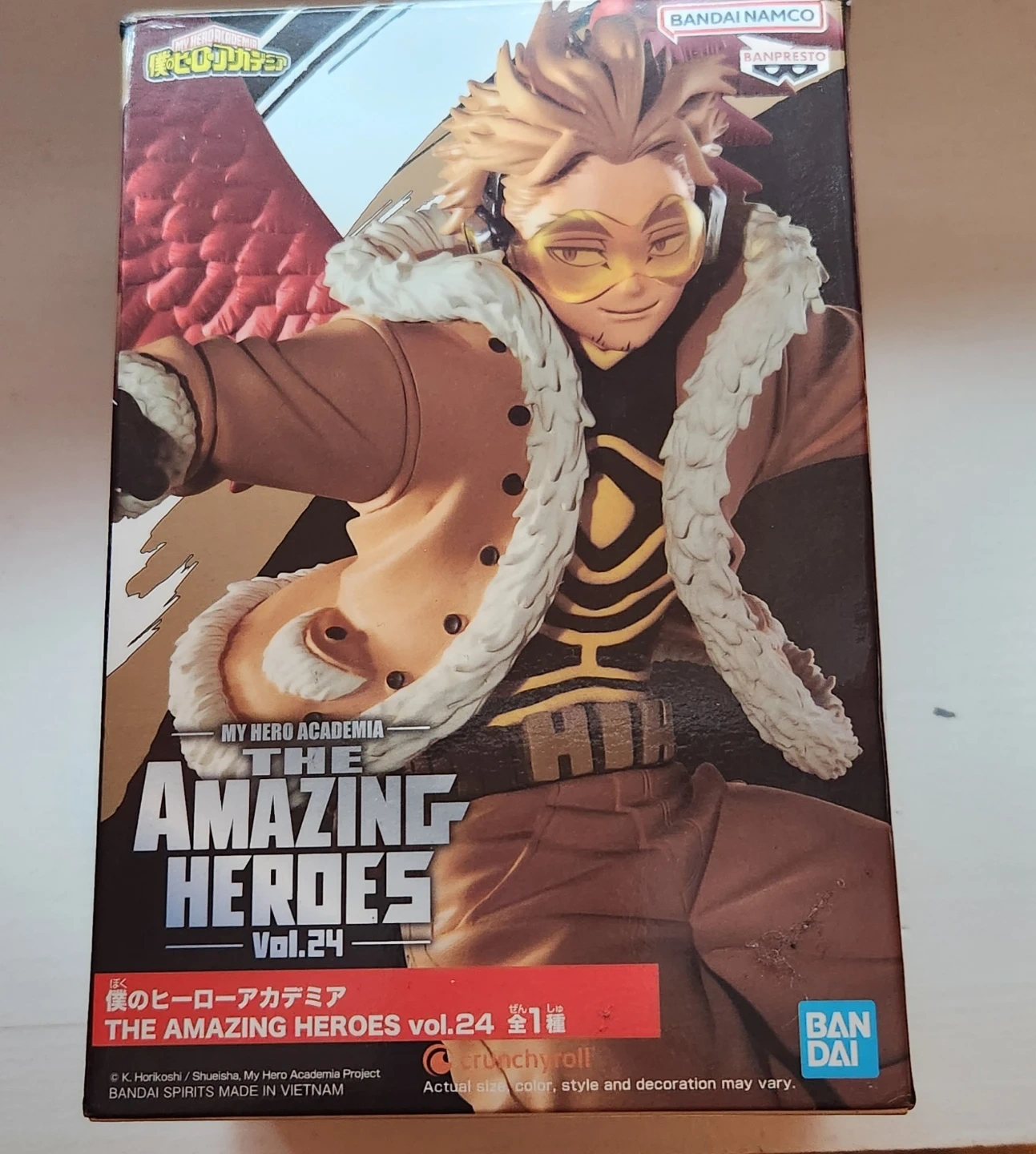 This is the Hawks figure from My Hero Academia's The Amazing Heroes Vol. 24 series. It comes with the original box. This collectible is for fans of the anime.