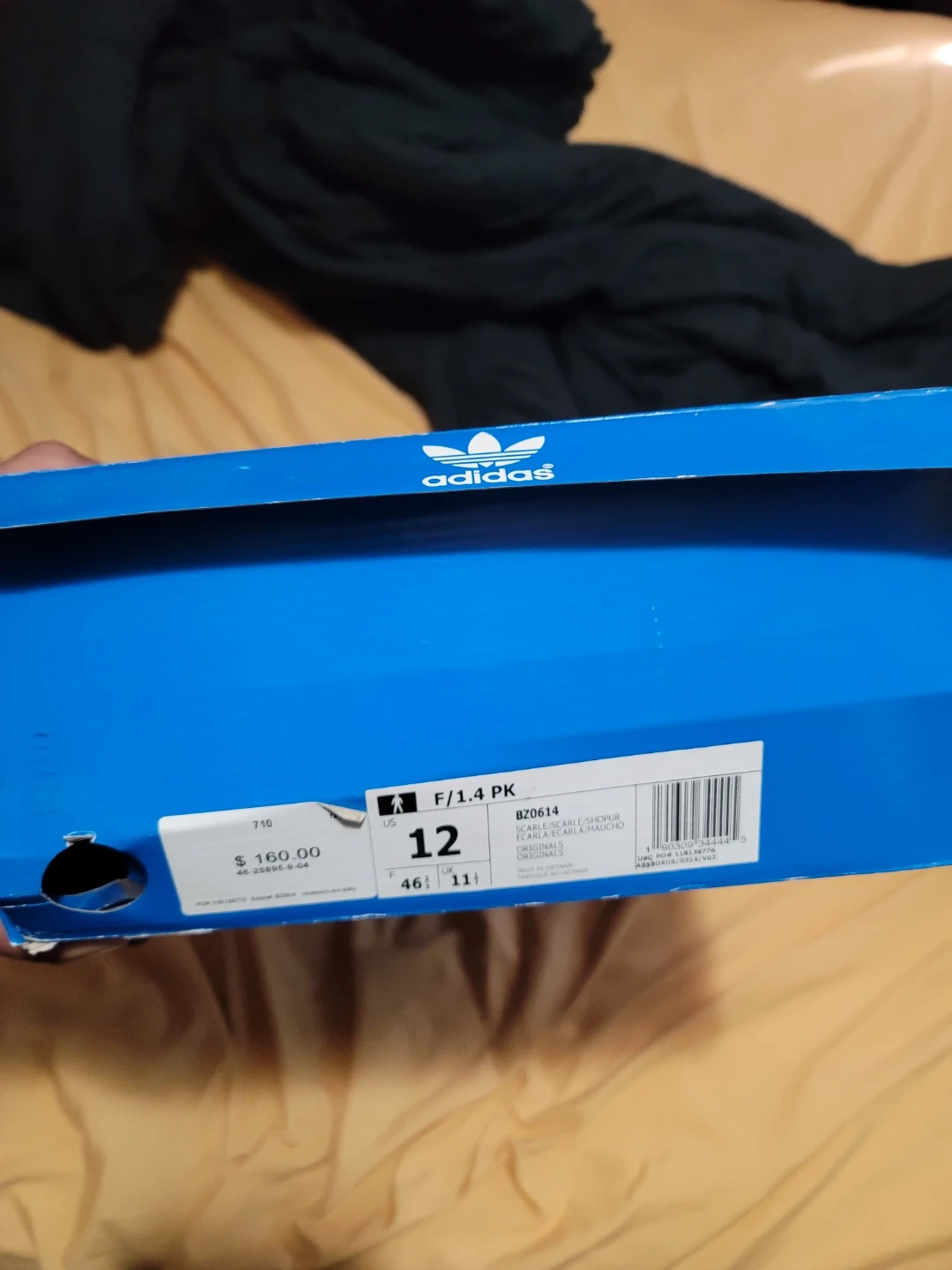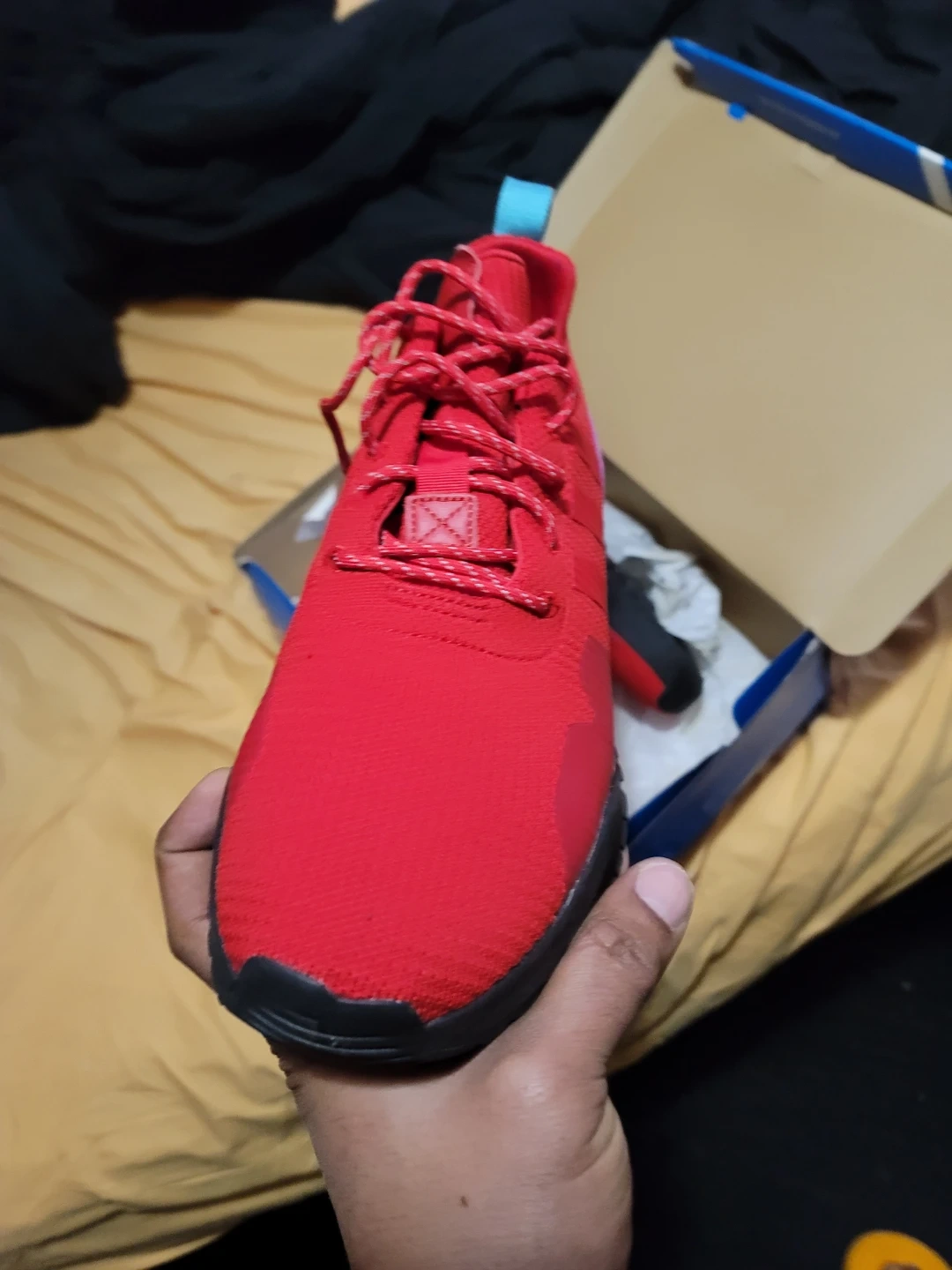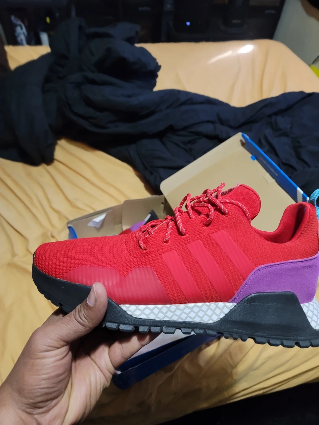These are red Adidas F/1.4 PK running shoes. They feature the iconic three stripes and a contrasting purple heel accent. Includes original box. Size is US 12.